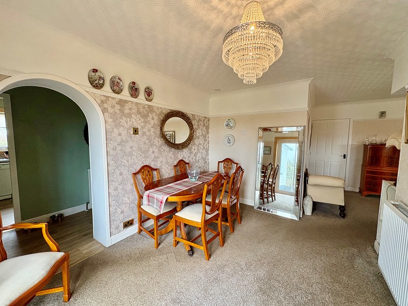 This beautiful room has a large picture window to the front elevation and benefits from dual aspect windows which have been fitted with roman blinds. A carpet has been laid to the floor; there is also an attractive Caithness flag fireplace with an enclosed coal fire. There is a picture rail fitted to the wall, a feature shelved alcove as well as two central heating radiators. There is a useful storage cupboard, power points and a stunning chandelier light fitting. A door gives access to a hallway and an opening leads to a stylish dining room.