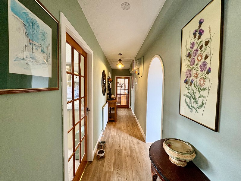 The bright dining room has a feature papered wall as well as a central heating radiator. Double sliding doors led out to the seating area of the garden. An arch creates a focal point within the room; there is a fitted carpet and power points throughout. The dining room leads into the internal hallway.