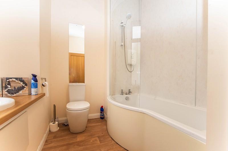 This spacious bathroom has a w.c. with a fitted mirror above. There is an opaque window that faces the rear elevation and a handbasin below that has been built into the sill. This room also benefits from an electric Triton shower over a bath with glass screen and wet wall surround. There is a heated towel rail to the wall. There is also a storage cupboard that houses the boiler with storage space above. Above a flush light fitting and extractor fan can be found.