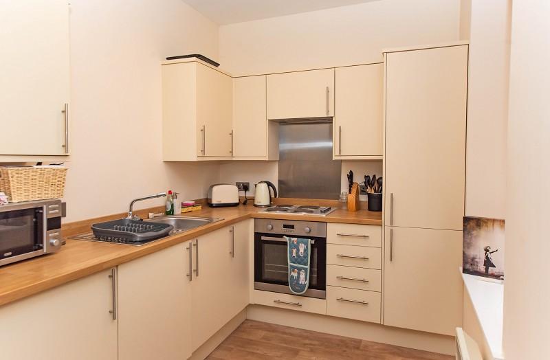 This attractive home offers bright and well-proportioned accommodation, comprising a spacious open-plan lounge, kitchen and dining area with dual-aspect windows allowing excellent natural light. The kitchen is fitted with cream wall and base units, complementary worktops and integrated appliances including an oven, hob, extractor, fridge and washing machine.