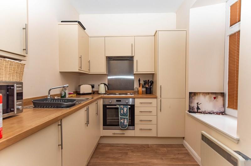 The kitchen has cream wall and base units with laminate worktops. Built into the units is a stainless-steel sink with a drainer and mixer tap. There is a four-ring hob with an integral electric fan oven below and a built-in extractor hood above. An integrated fridge and washing machine can be found in the units below. There is a window in the front elevation that lets in a lot of natural daylight with an electric radiator on the wall below. Above a flush light fitting and heat detector can also be found. The walls have been painted neutrally, and the flooring has been laid to wood-effect vinyl.