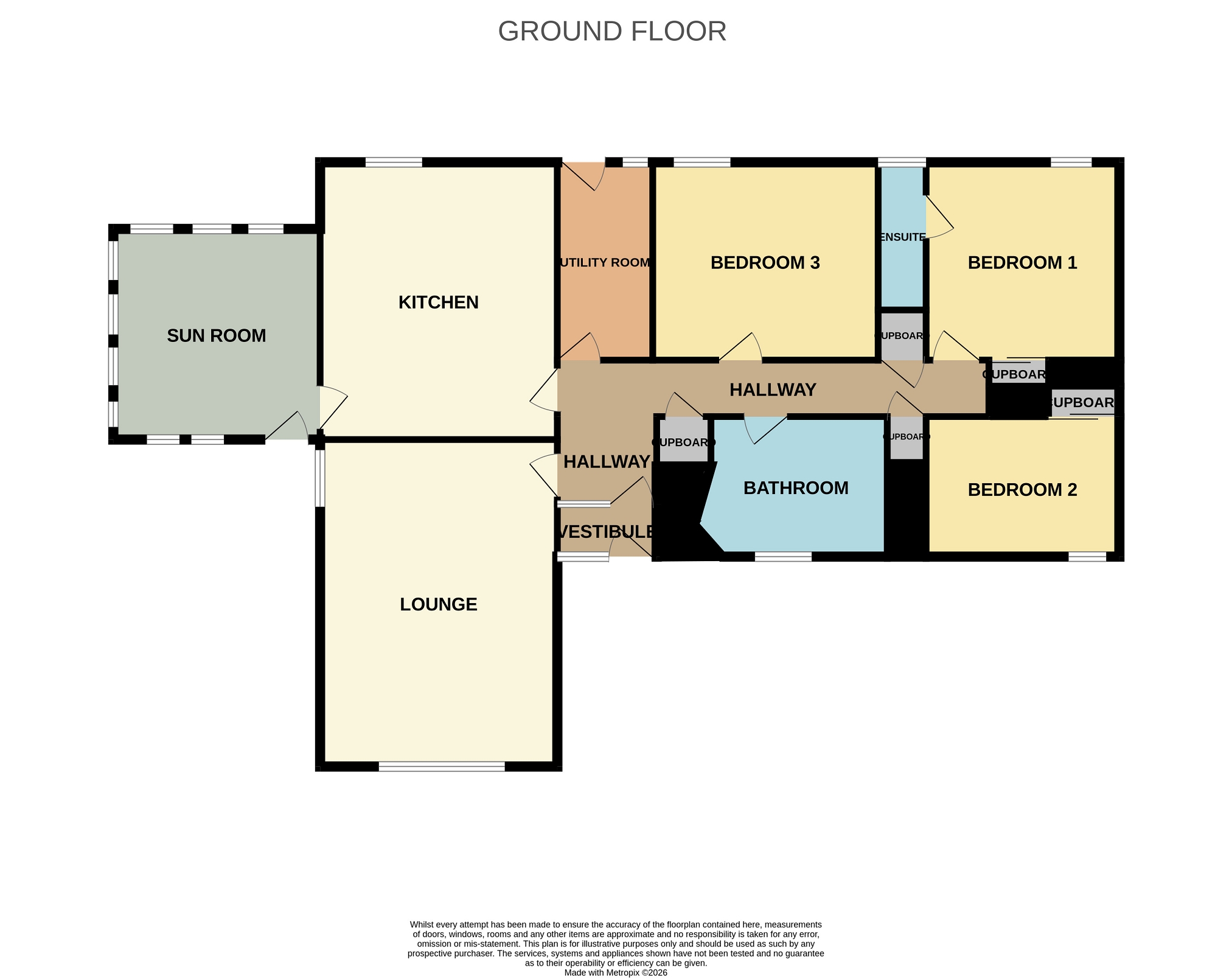 The beautifully appointed kitchen has an excellent selection of oak base and wall units with laminate worktops. There is a stainless-steel sink with a drainer, a freestanding cooker, an integral fridge, as well as chrome power points. There is a central heating radiator, two chrome ceiling lights and a heat detector. Ceramic tiles have been laid to the floor and double doors give access to the sun room. A window with roller blinds faces the rear elevation.