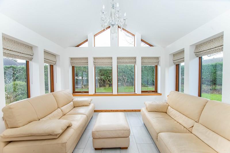 This superb room boasts a vaulted ceiling and a beautiful chandelier. There is a smoke alarm, triple aspect windows with blinds and a ceramic tiled floor. A partially glazed UPVC door leads out to the landscaped gardens.