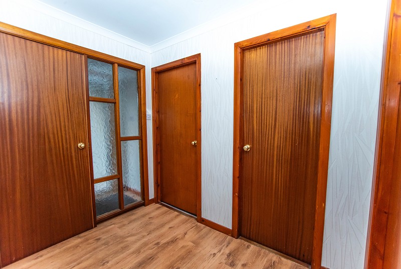 This L shaped hall is of good proportions. There are three deep storage cupboards, a central heating radiator, a power point and two flush light fittings. A hatch gives access to the loft void, there is coving and a smoke alarm. Doors lead to the lounge, kitchen, bathroom and three bedrooms. There is also a phone point.