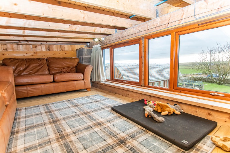 The downstairs workshop has been divided into three separate areas to incorporate a study, WC and workshop. Within the study is a multi-fuel stove which provides heat for the whole building. There is light and power throughout, with the workshop area benefitting from a Belfast sink and built-in work benches. The WC has a wall mounted basin and a white WC. Services have been installed for both a washing machine and a dryer. The workshop can be accessed from both the front and rear and also benefits from two garage doors. Stairs give access to the upstairs family room which has light and power, the family room enjoys an outlook over the surrounding countryside.