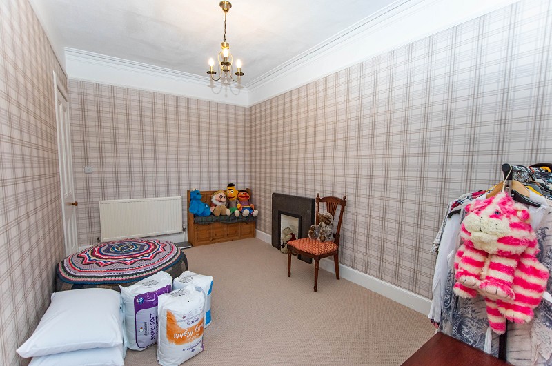 This spacious room benefits from coving and features a brass drop down light fitting. A carpet has been laid to the floor, there is a central heating radiator as well as a window to the rear elevation. A Caithness Flag fireplace creates a focal point within this lovely room.