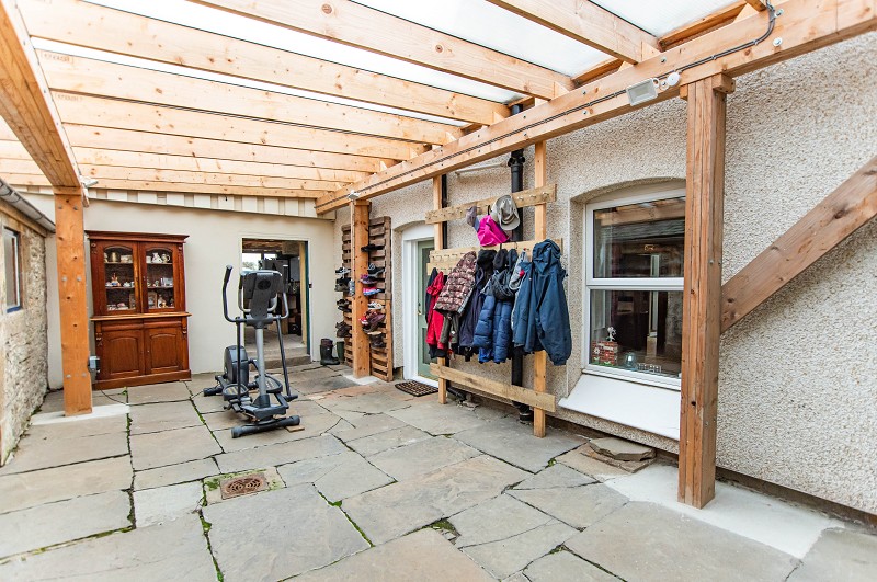 This area of the home has a lean-to pergola with a covered roof and Caithness Flag flooring. Doors give access to two storage rooms and a superb workshop.