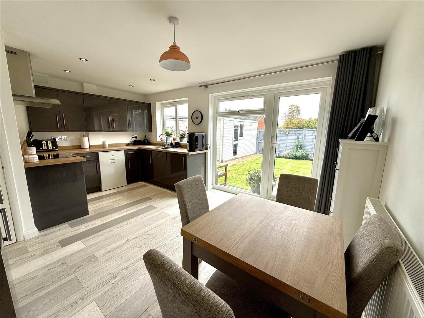 Family Kitchen / Dining Room - 4.88m x 3.61m max (16'0 x 11'10 max) - Modern fitted kitchen to comprise single drainer sink unit with mixer tap, cupboards under, range of base and wall mounted units, integrated electric oven with four ring hob over, cooker hood above, integrated dishwasher, oil-fired central heating and domestic hot water boiler, large built-in cupboard under the stairs, radiator, rear aspect window, fully glazed UPVC door to the private rear garden.