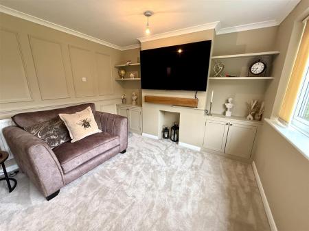 Living Room - 4.88m x 3.35m (16'0 x 11'0) - Open fireplace (which could be opened up) with solid wood beam over, built-in display cabinets to either side with shelving over, double radiator, front aspect window with outlook over the gardens.