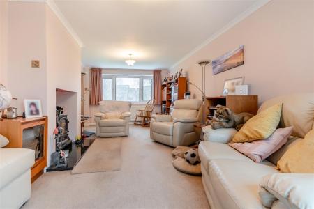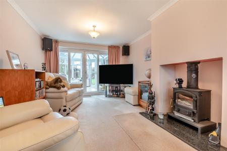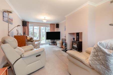Lounge - 6.60m x 3.43m (21'8 x 11'3) - Fireplace with inset wood burning stove, raised hearth, single and double radiators, front aspect window with built-in blinds, fully glazed sliding doors into: