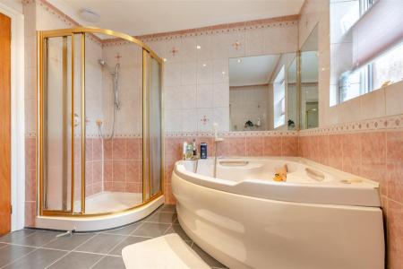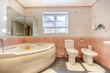 Bathroom - Corner jacuzzi bath with shower over, tiled surround, separate shower cubicle and tray, tiled surround, close coupled WC, bidet, pedestal wash hand basin, mirror over, two heated towel rails, side aspect frosted window.