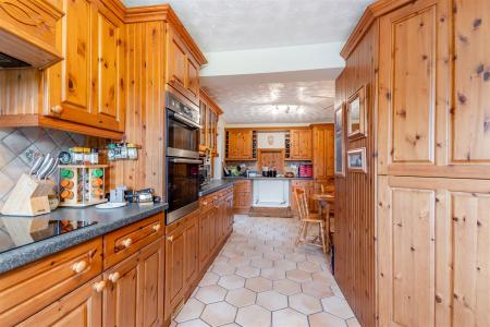 Kitchen - 7.06m x 2.95m (23'2 x 9'8) - Fitted kitchen comprising of one and a half bowl, single drainer sink unit, mixer tap, cupboards under, range of base and wall mounted units, integrated electric double oven, four ring hob, cooker hood above, walk-in pantry cupboard, integrated fridge and dishwasher, various worktops, shelving, tiled flooring, single and double radiators, wine rack, rear aspect window with built-in blinds, half glazed door into:
