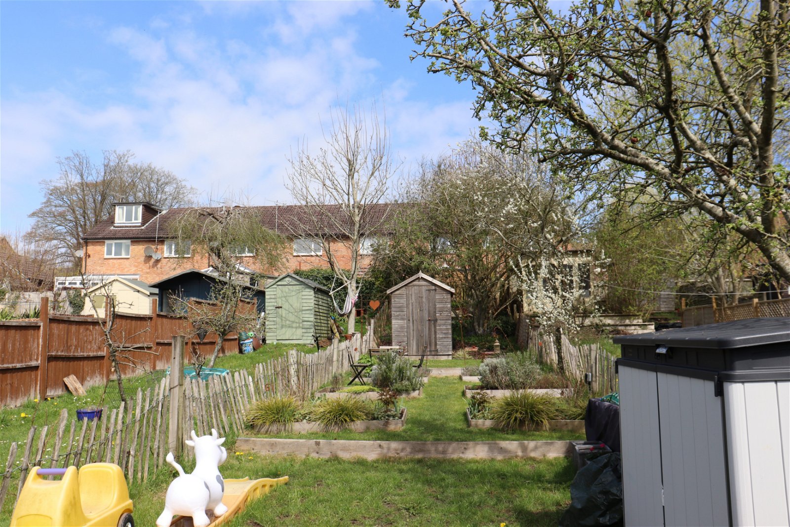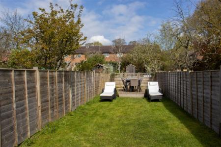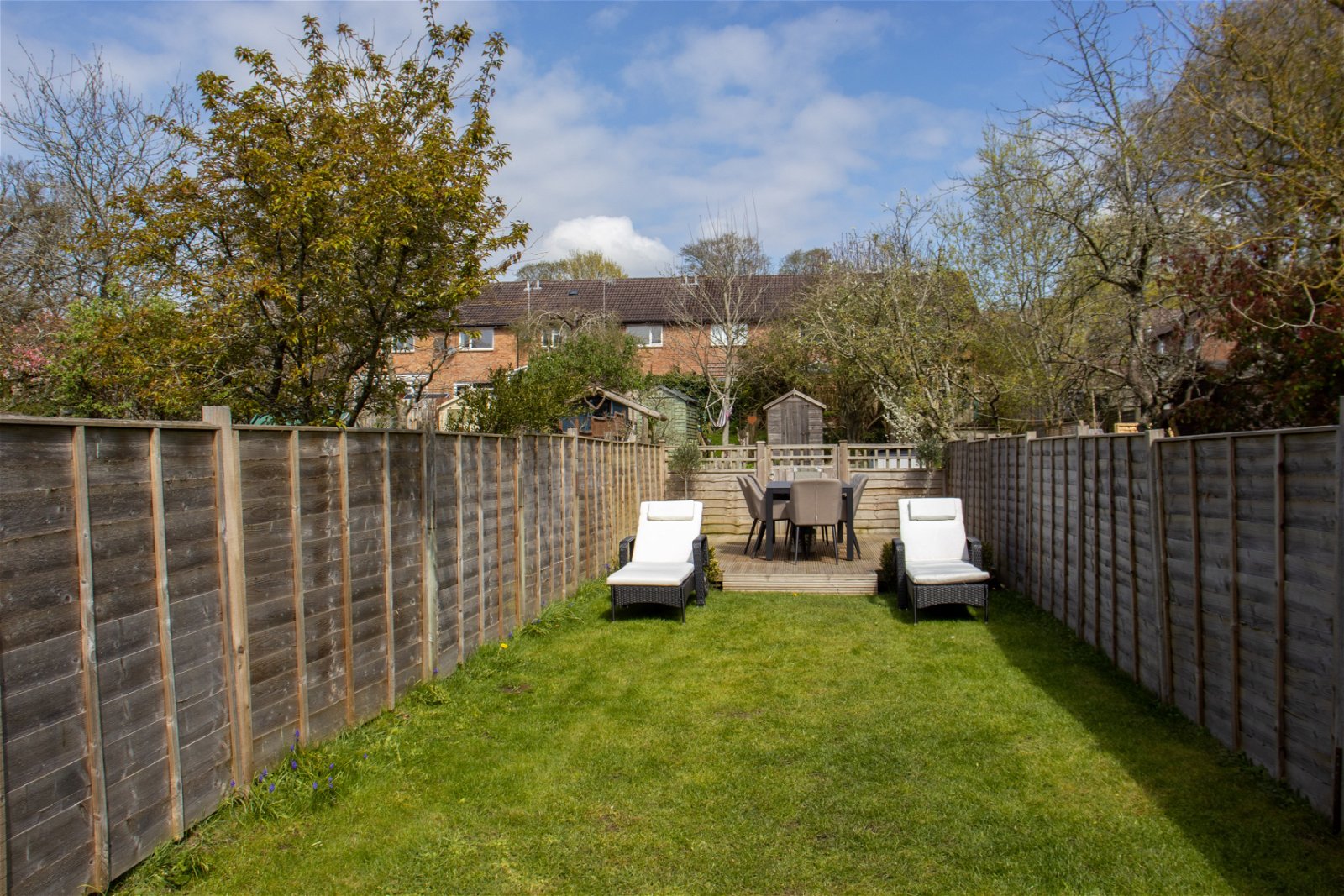 - Long Split Garden Featuring Decking, Lawn and Raised Beds