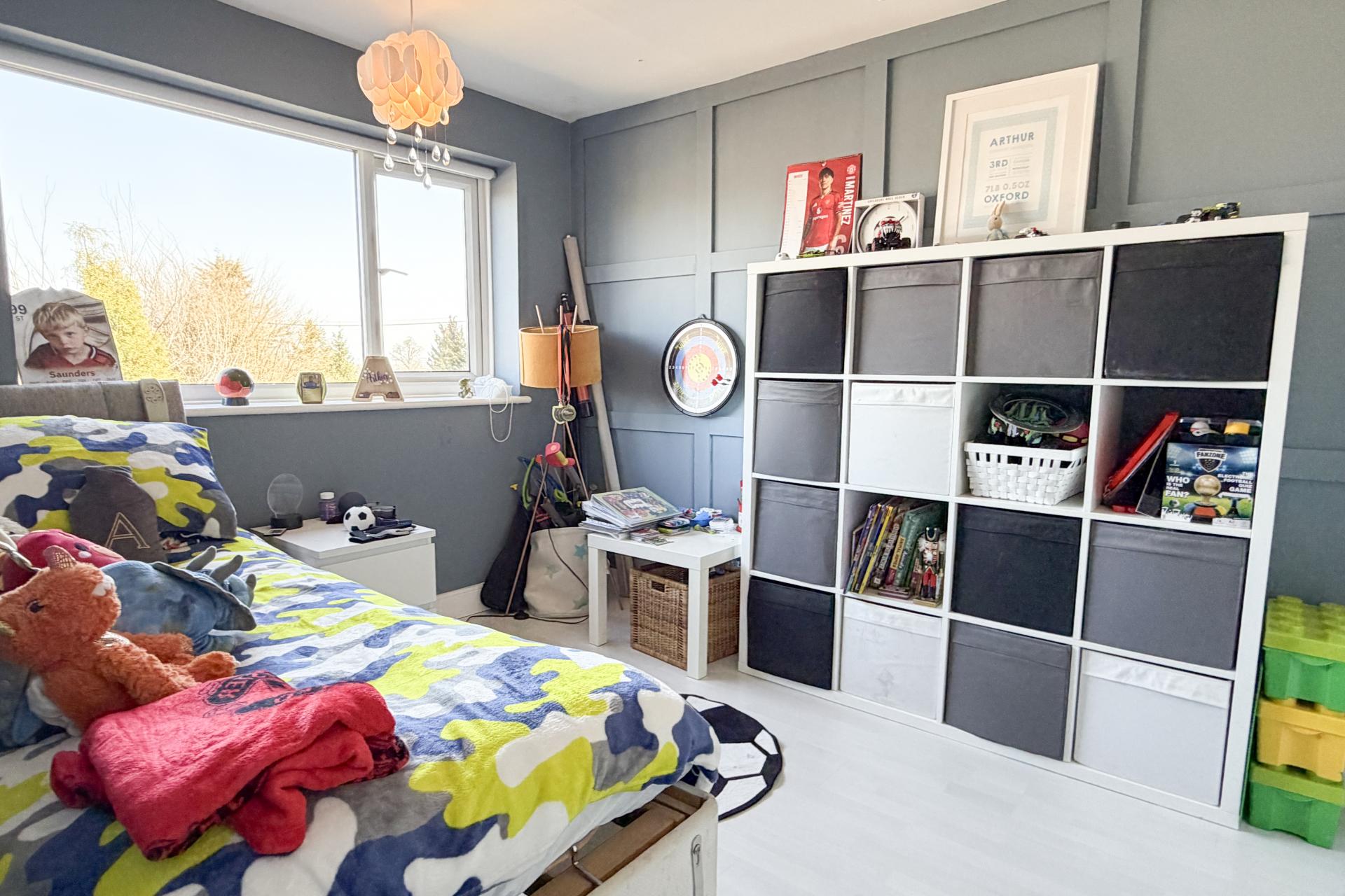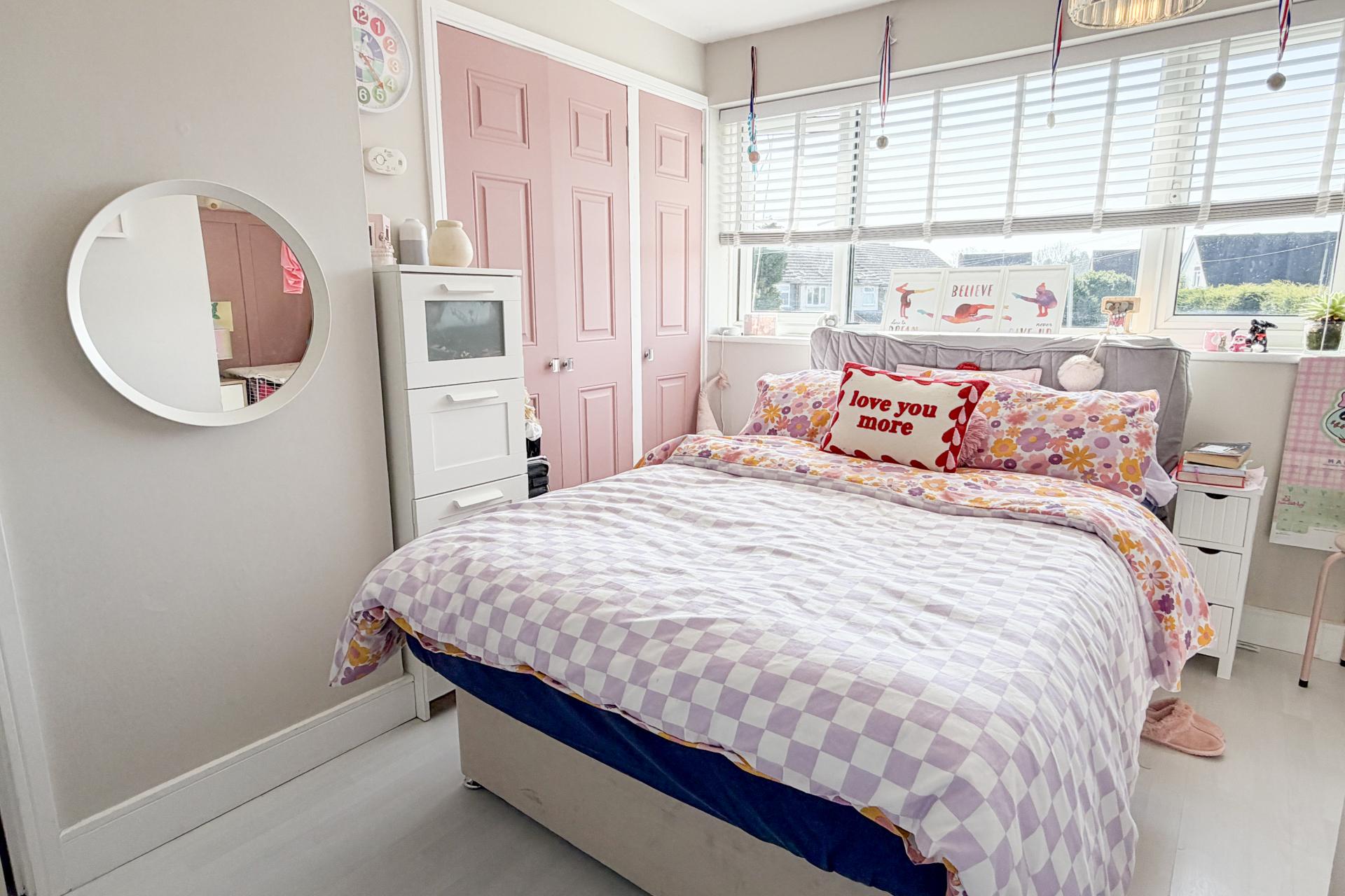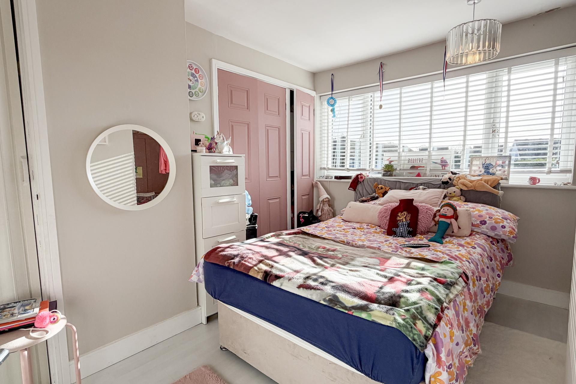 Stairs rise to the first floor, where you will find two well-proportioned double bedrooms one overlooking the front and one to the rear. The front bedroom benefits from an alcove and fitted cupboards while the second bedroom features a built-in cupboard and is currently arranged as a child’s bedroom. A family bathroom serves this floor, fitted with a white suite that includes a bath with a power shower, offering a clean and modern aesthetic.