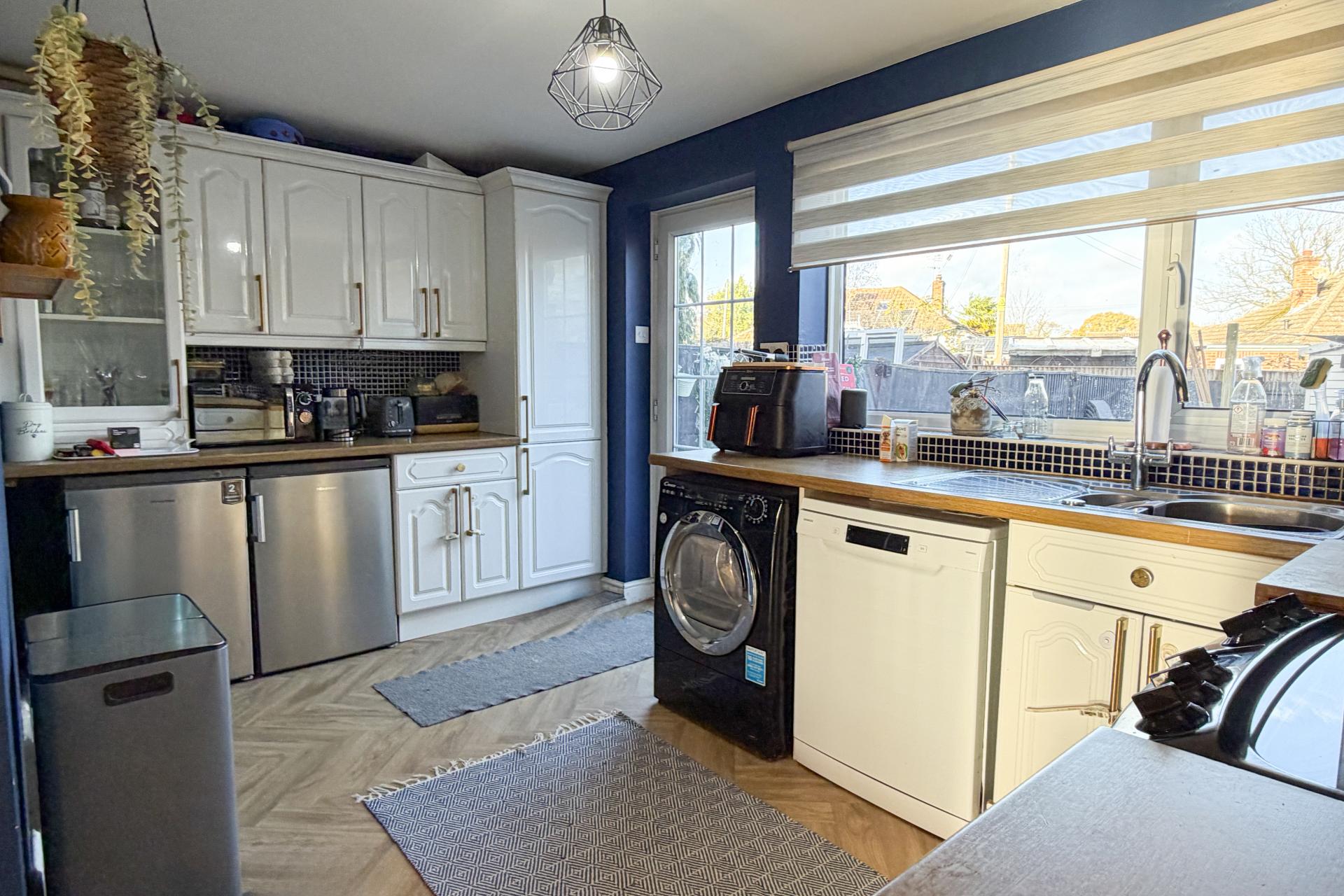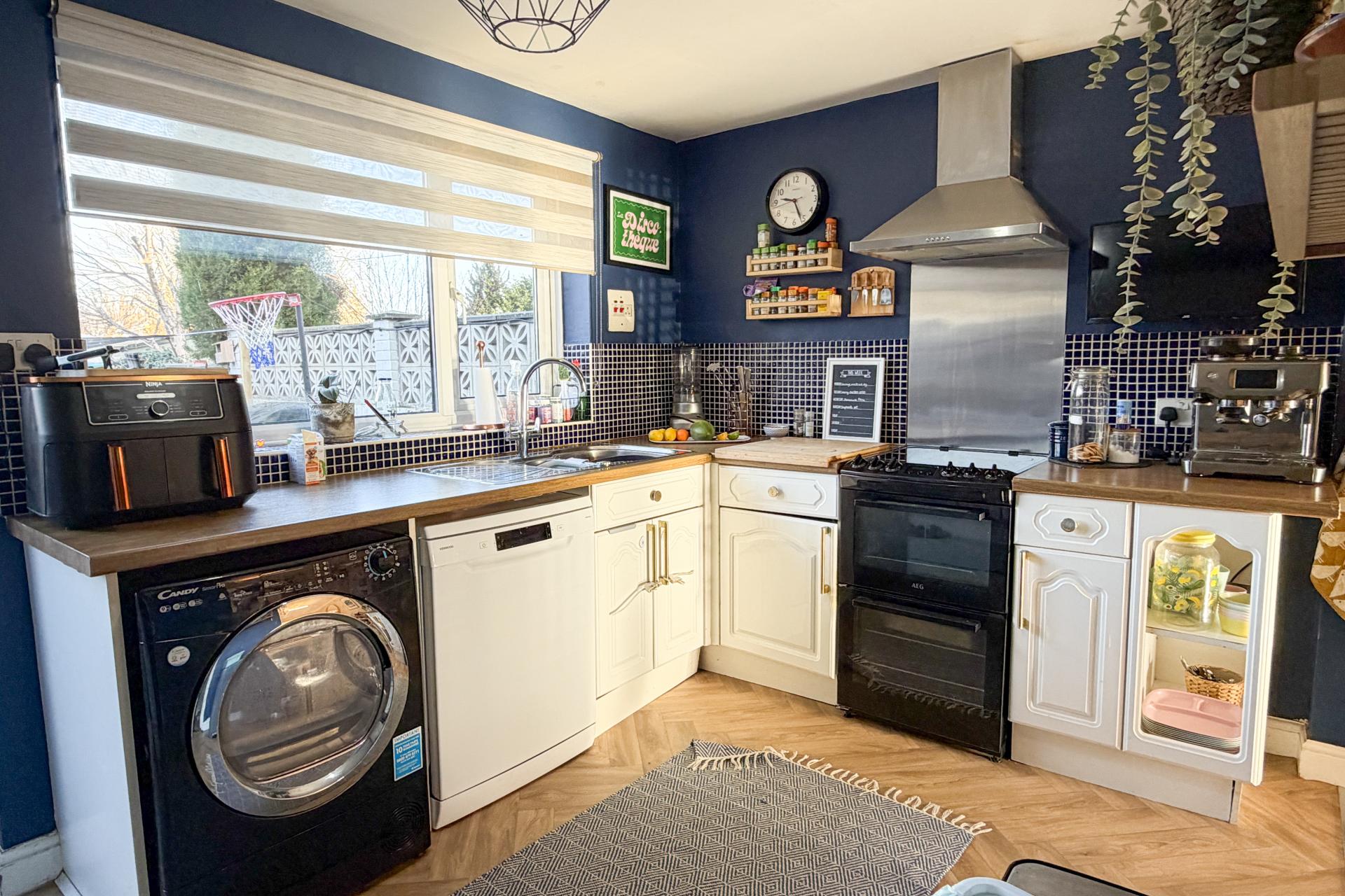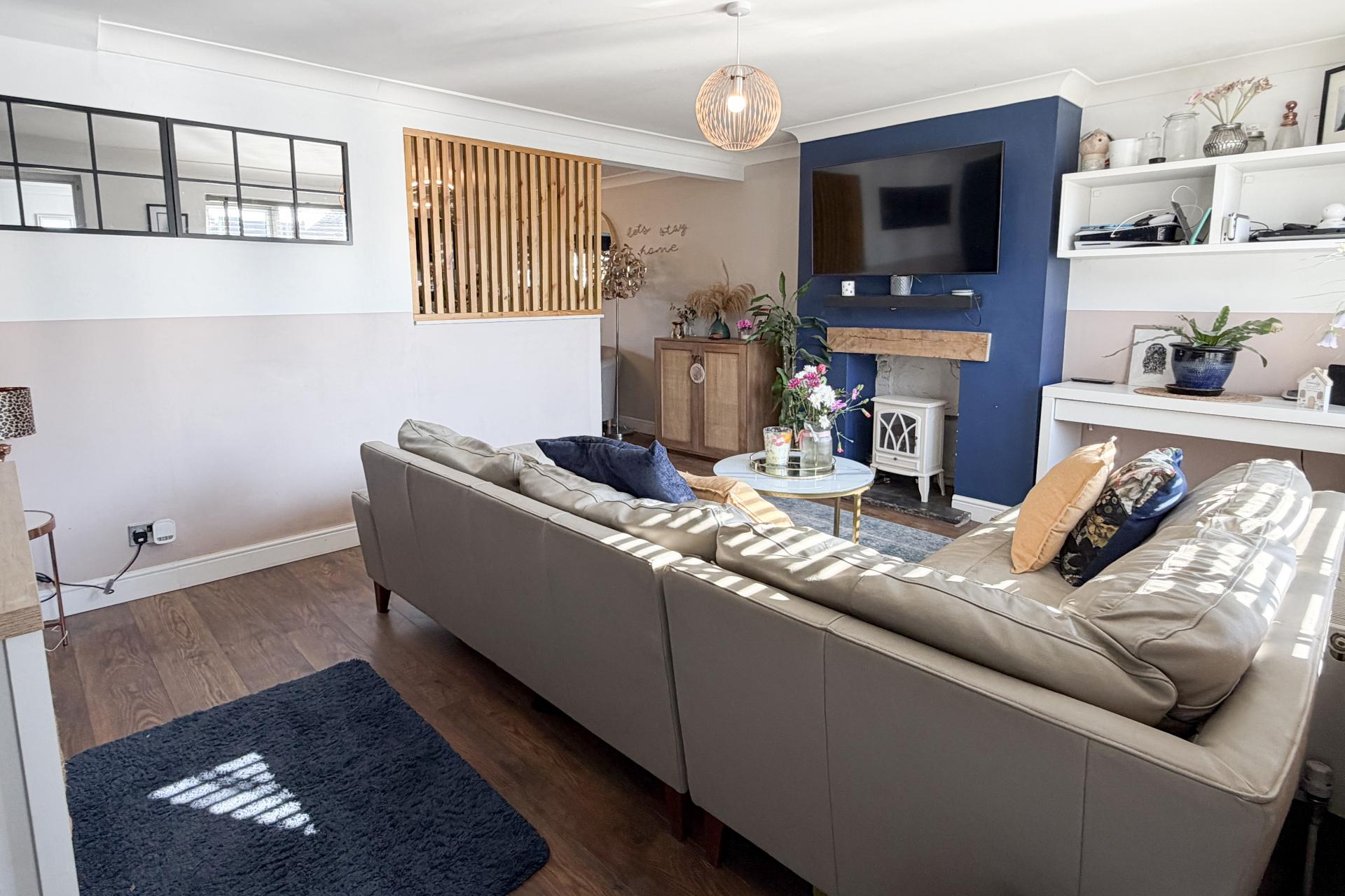 Upon entering, you are welcomed into a useful porch, before stepping into the inviting sitting room. Filled with natural light, this comfortable space centres around a charming fireplace and features sleek LVT flooring. The sitting room flows into the dining area, creating a lovely open feel, and from here you continue through to the kitchen. Bright and functional, the kitchen is fitted with white wall and floor cabinets, complemented by tiled finishes and delightful views across the garden. A door from the kitchen opens into the rear hallway, which in turn leads to the ground floor cloakroom- thoughtfully designed to include space for the washing machine. This room has been recently refurbished by the current owners, adding a fresh and modern touch.