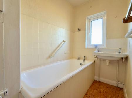 Part tiled. Panelled bath. Opaque UPVC double glazed window to rear. Wash hand basin. Storage cupboard.