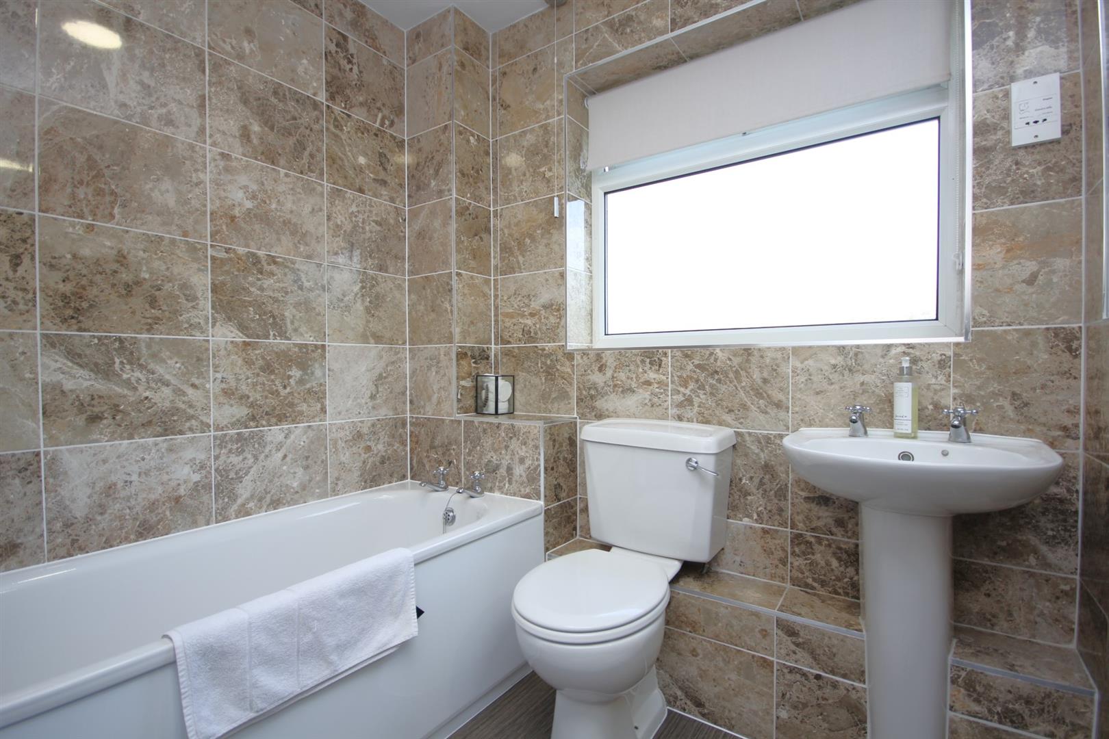 Modern re-fitted family bathroom comprising three piece white suite & attractive tiling