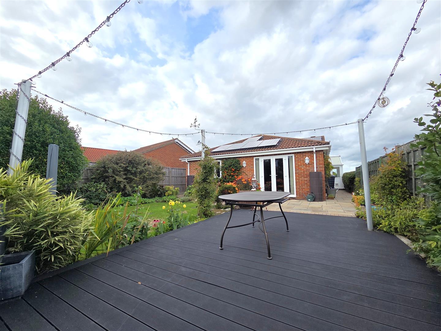 Landscaped rear garden enjoying area laid to lawn, large composite decked sun terrace with hot tub to remain, mature shrubbery/flowers