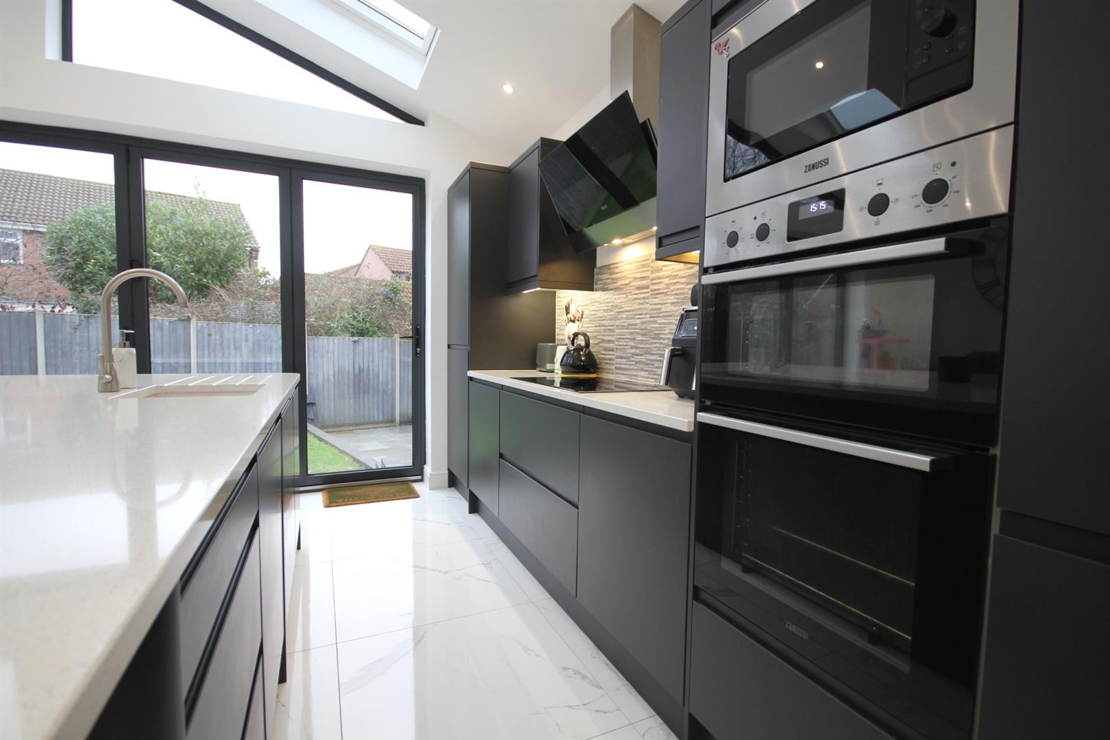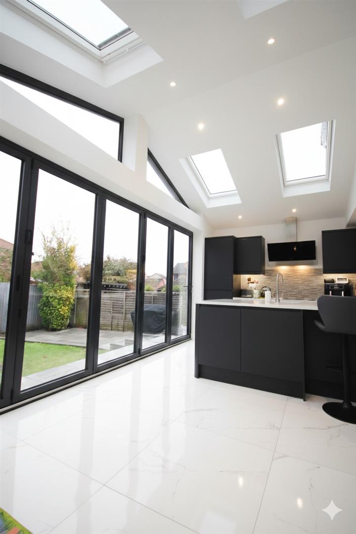 Impressively sized 31'ft open plan kitchen/dining/living room with bi-fold doors opening out to the rear garden & four Velux windows