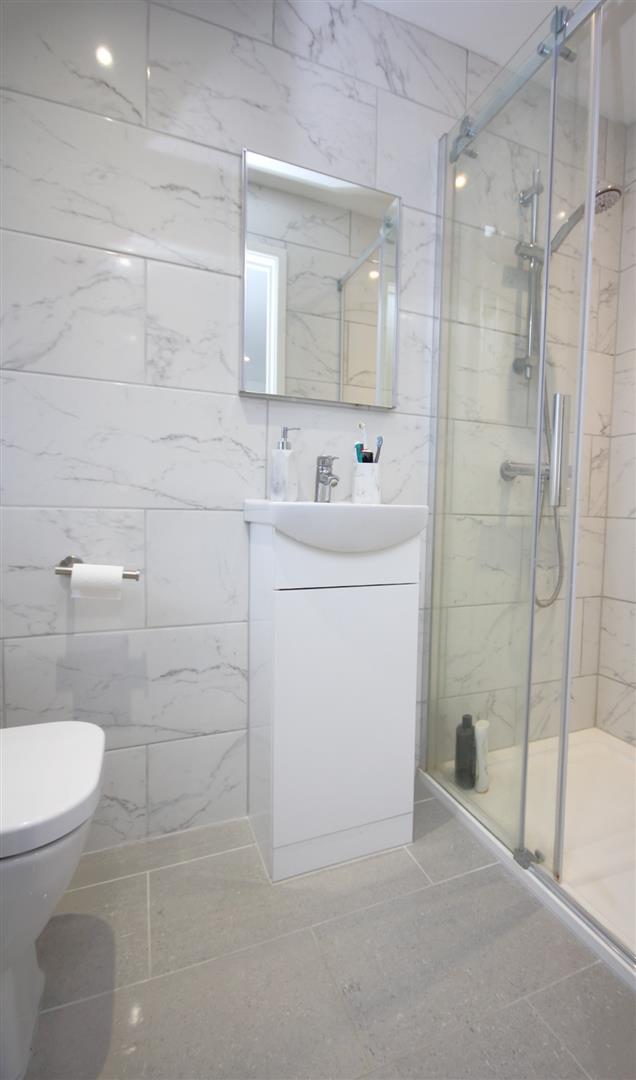 Modern en-suite shower room comprising three piece white suite, feature low profile walk in shower cubicle tray with attractive marble effect wall/floor tiling