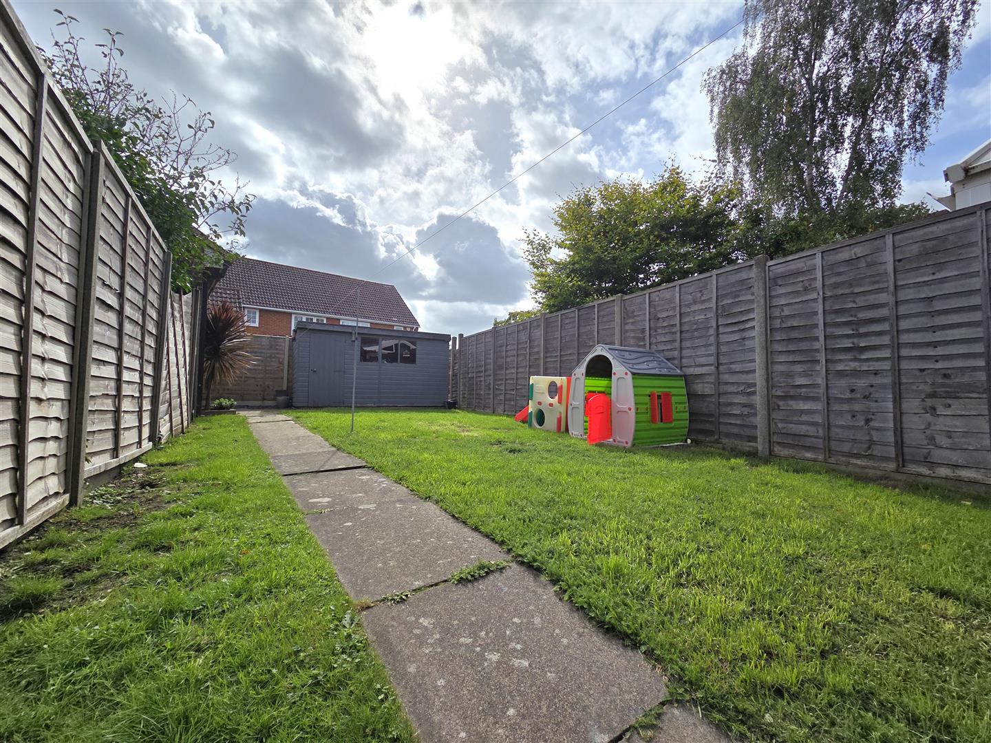 Landscaped rear garden with majority laid to lawn, paved patio area & shed to remain