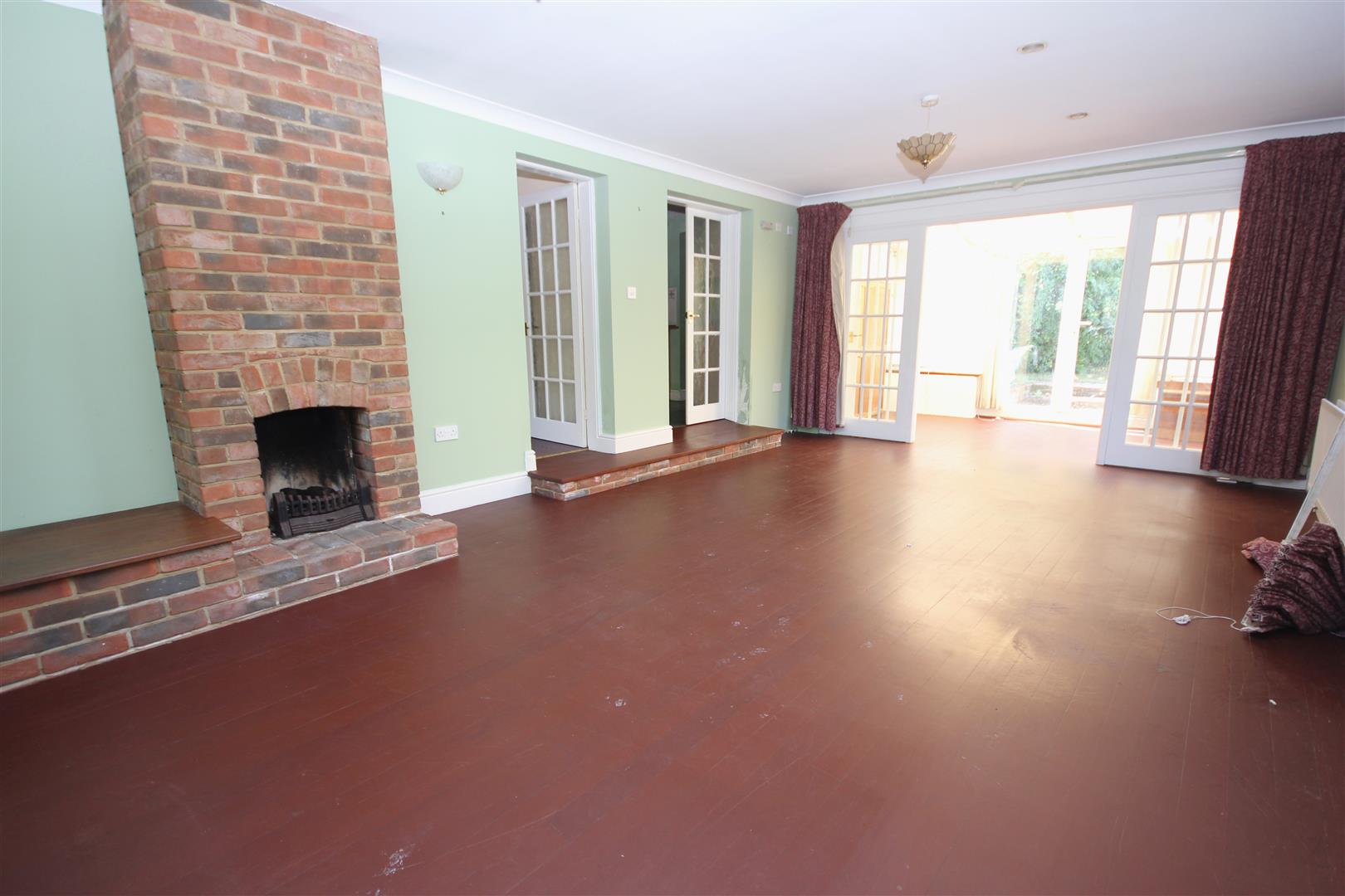 21'10ft Dual aspect living room with brick surround fireplace & double doors opening out into the conservatory