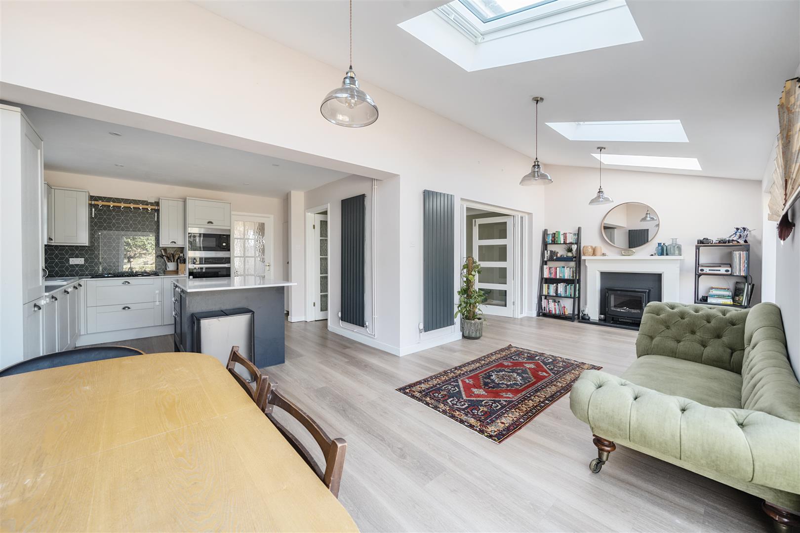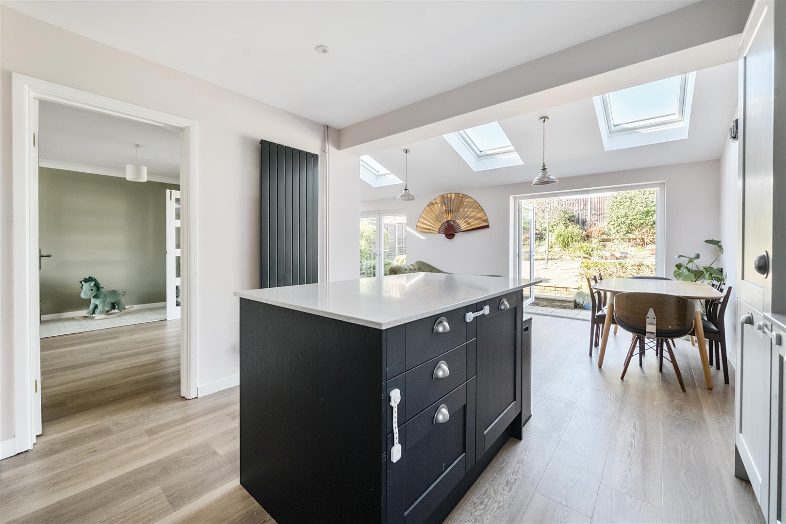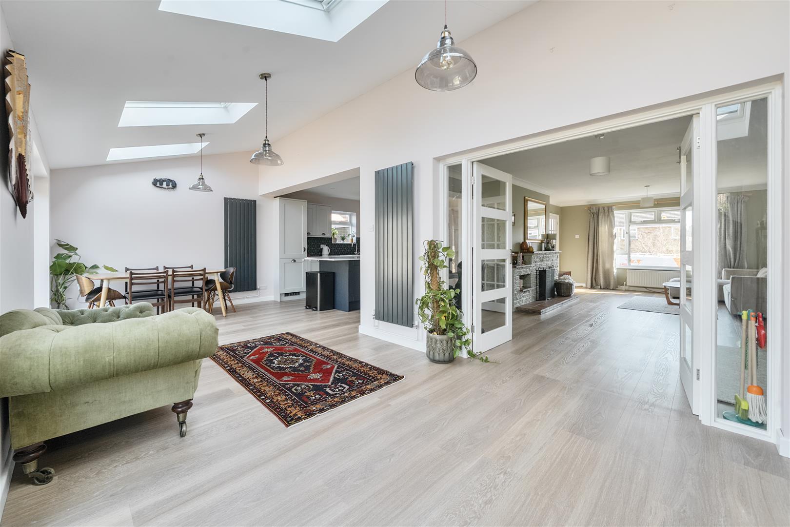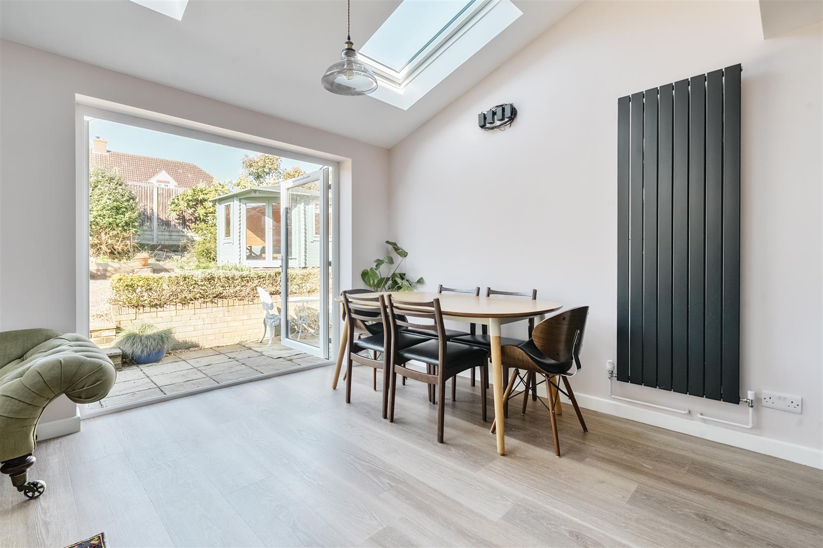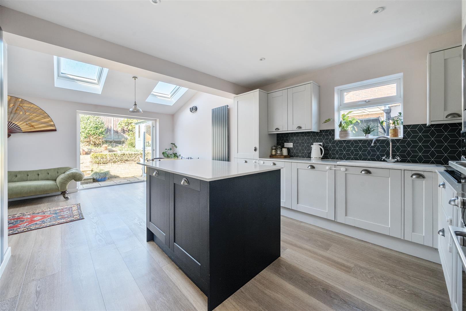 On entering, the adjacent Sitting Room is well proportioned with an open fireplace and twin bespoke double doors opening into the rear reception room, perfect for entertaining with friends and family. The stunning extension, built in 2021, spans the width of this wonderful home and offers an impressive contemporary live in Kitchen/Dining/Family Room, lit by four electric velux windows, twin French doors open out onto the garden. The Kitchen itself, also refitted in 2021, has stylish dove grey and navy shaker style cupboards with pewter handles and quartz worktops, there is an island with a breakfast bar, perfect for informal dining; a range of appliances are also included. There is also a large larder cupboard tucked in a corner. Upstairs, are three generous double bedrooms leading off the spacious Landing, complimented by a large four-piece bathroom suite with roll top bath. The garden is west facing, enclosed and well-tended, with raised flowerbeds and mature shrubs; there is a beautiful Summerhouse tucked in one corner adjacent to a deck terrace to relax and enjoy the southerly sunshine. Properties in this location rarely come onto the market as the location allows you to combine village life with the convenience of parking and privacy.