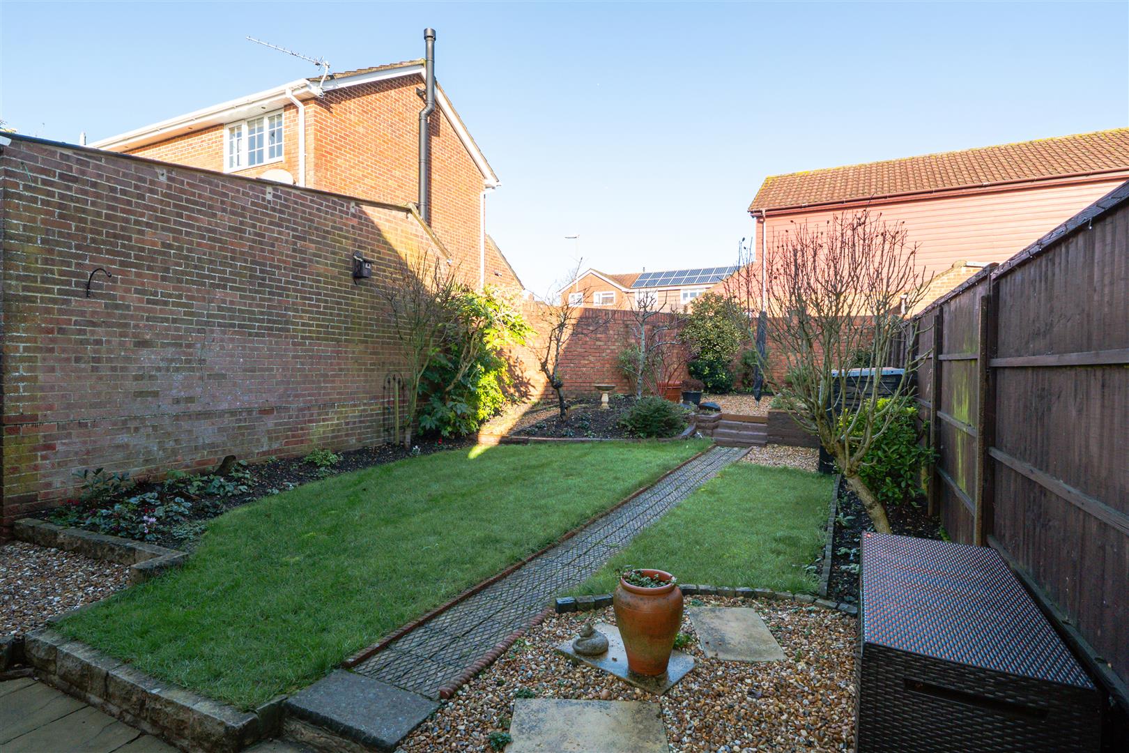 This much-loved home has been owned by my clients for twenty years and has been beautifully maintained throughout. There is a low maintenance front garden with adjacent parking leading to the garaging and steps lead up to the front door. On entering there is an inner lobby leading you through a doorway into the heart of the home; double glazed doors lead off the Hallway into the spacious Sitting Room which centres on an electric fire and with large windows to the front drawing in sunlight from the south. The Dining Room is positioned to the rear of the house with a pretty outlook over the garden and the Kitchen leads off this room; there is an opportunity to reconfigure this space to create a contemporary open plan space. The Kitchen was refitted in 2022 with cream wooden cupboards and oak worktops and a range of integrated high specification appliances are included; a door leads to outside. Upstairs are three bedrooms, two of which are good sized doubles and there is a particularly large Family Bathroom with a separate shower and ample vanity storage cupboards. The part walled back garden has been thoughtfully planted with shrub borders and pretty trees, a large terrace spans the width of the house which is ideal for entertaining and a pathway leads to a further gravel terrace for capturing the evening sun. The garage has a water tap and a utility area with space for a washing machine and tumble dryer and there is gated side access down the side of the house.