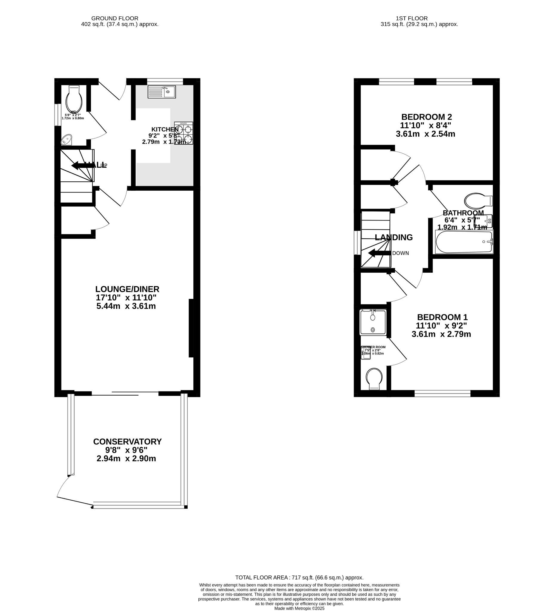 Low level close coupled WC. Tiled shower cubicle. Wash hand basin. Radiator. Part tiled walls. Extractor fan.