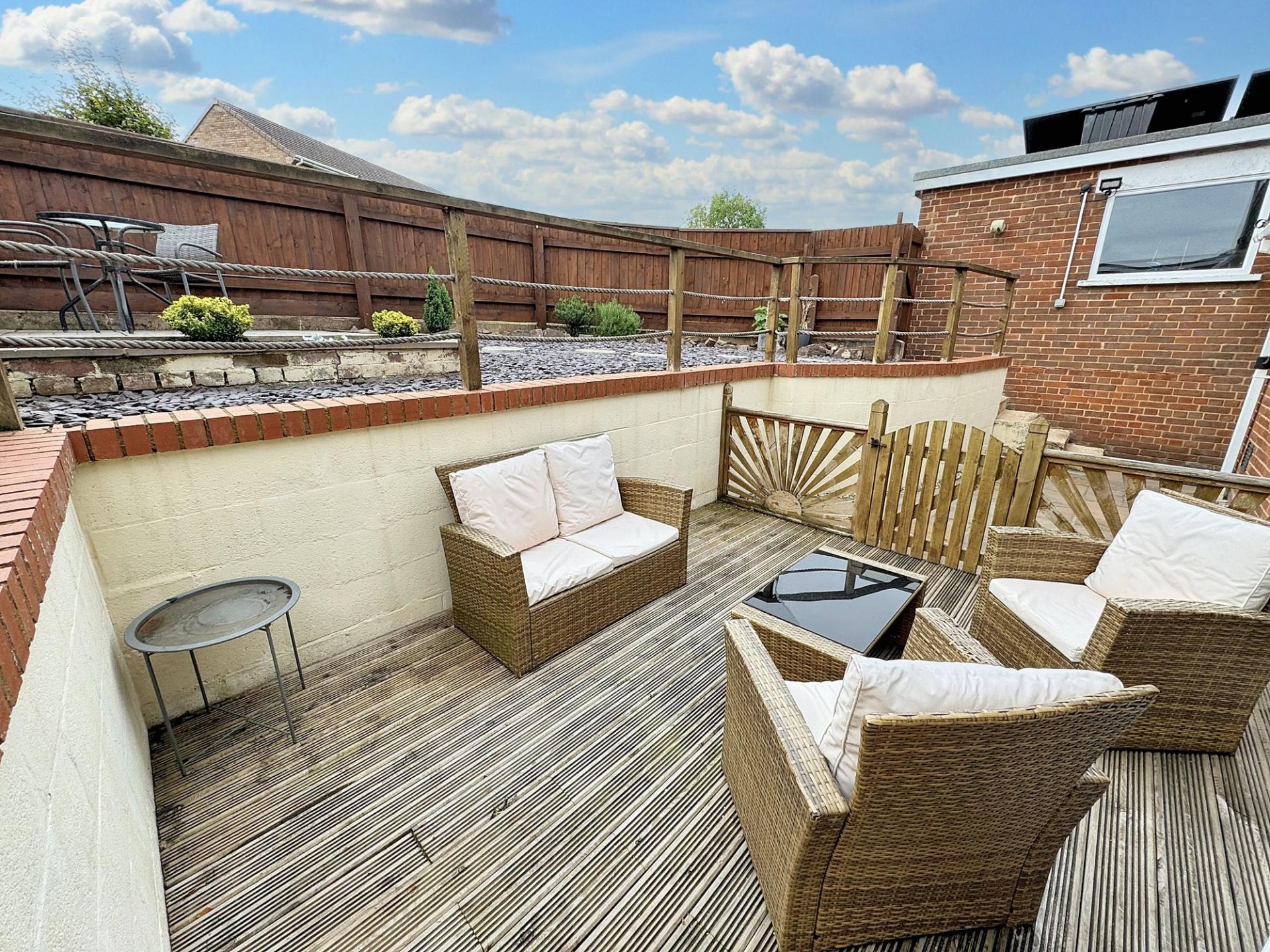 - South-facing, low-maintenance rear garden with decking, patio, and raised seating area — ideal for outdoor entertaining.
