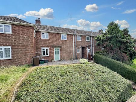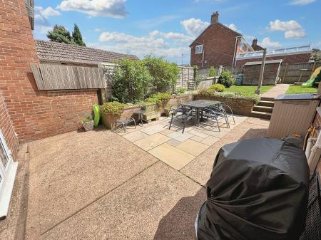 - Front garden with paved terrace and mature shrubs—ideal for afternoon and evening sun