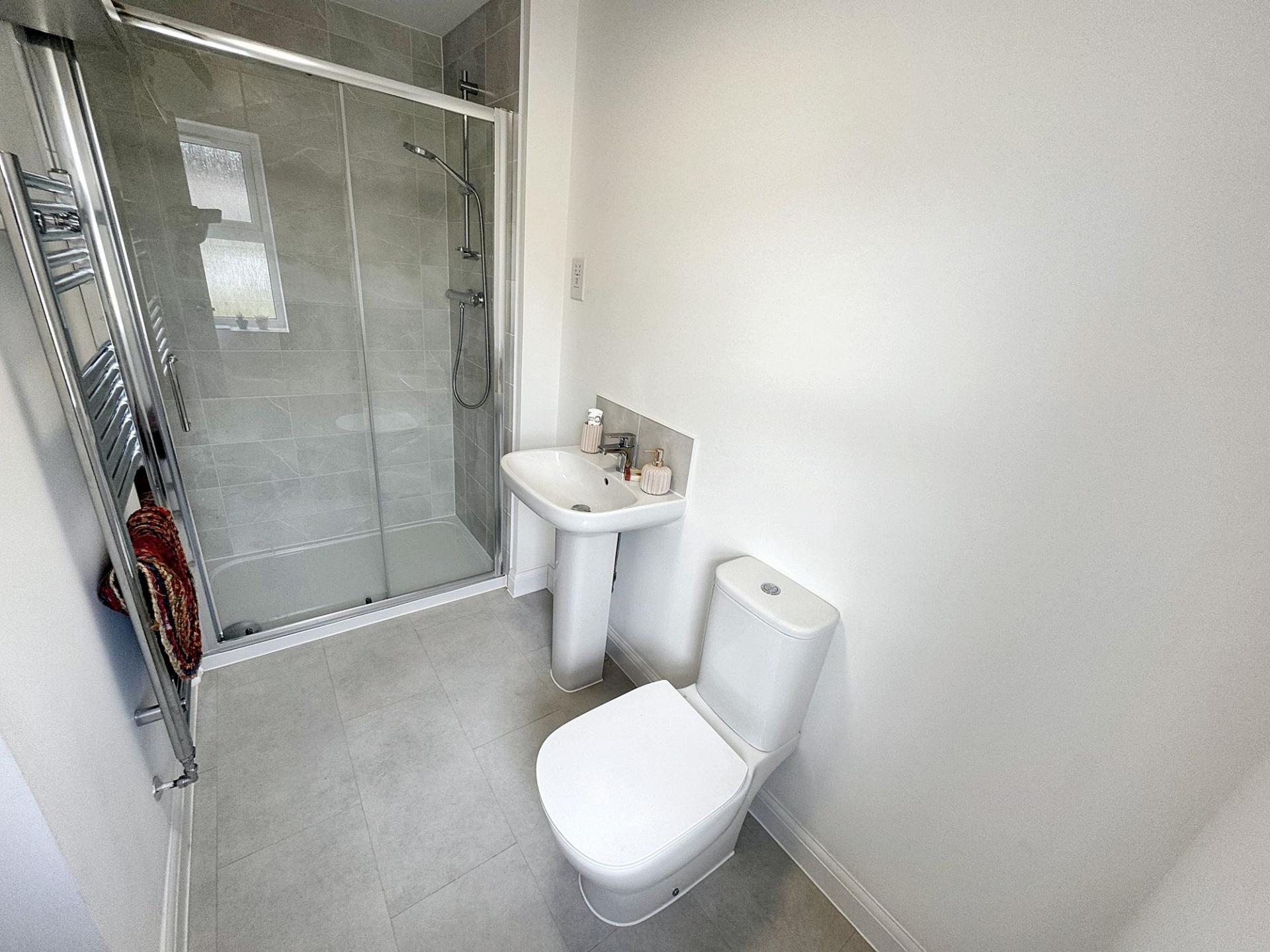 - Stylish family bathroom with chrome fittings & shower-over-bath