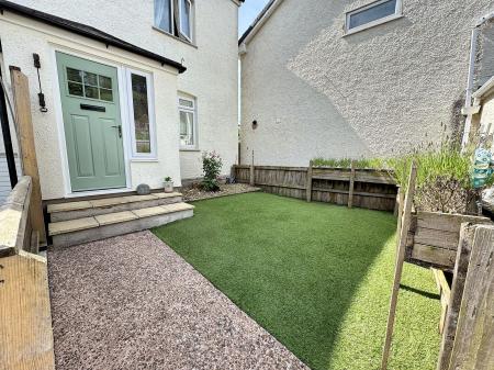 - Attractive low-maintenance front garden with artificial lawn and raised beds