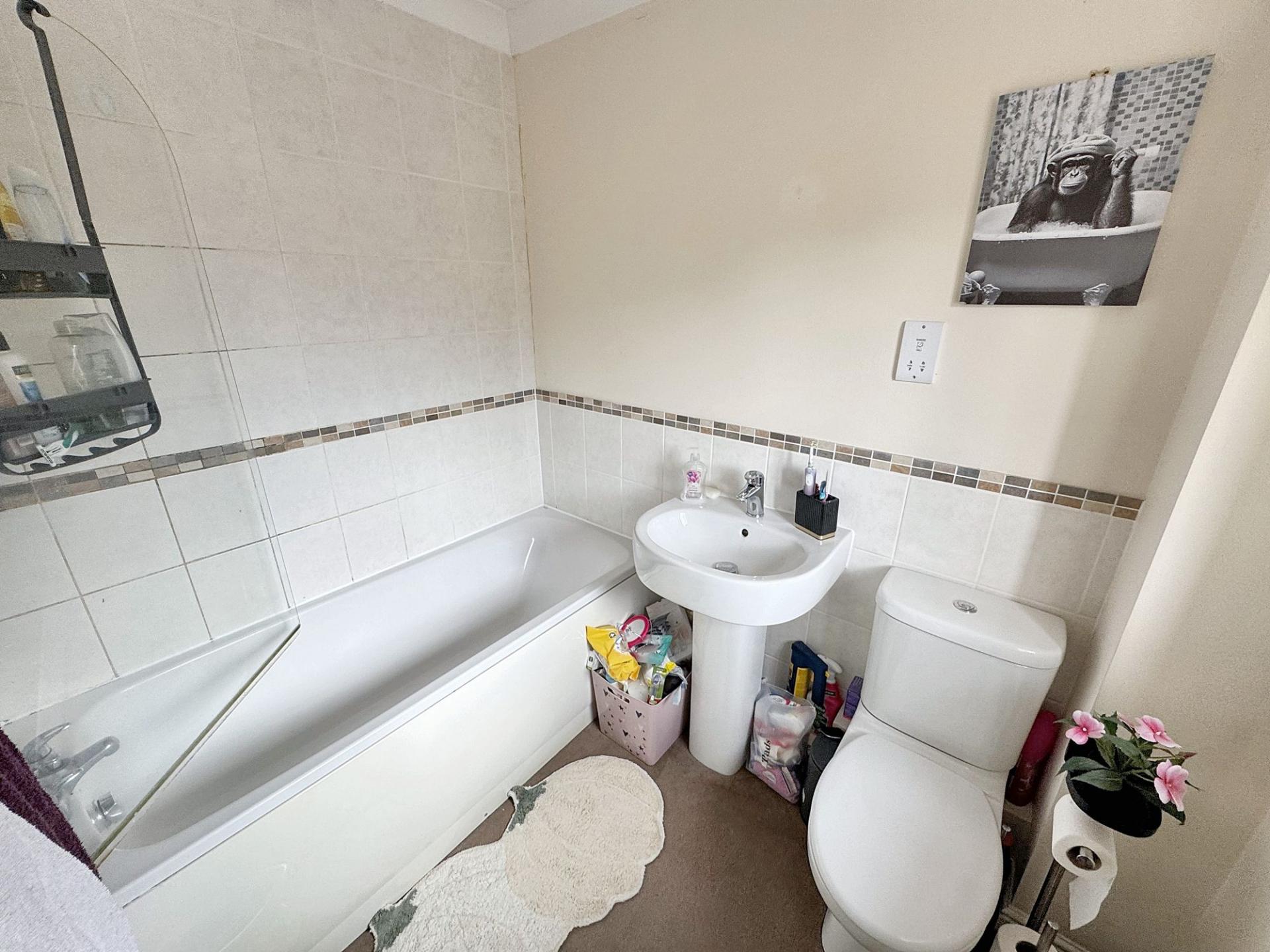 - Bathroom – Contemporary white suite with bath, electric shower, wash basin and WC.