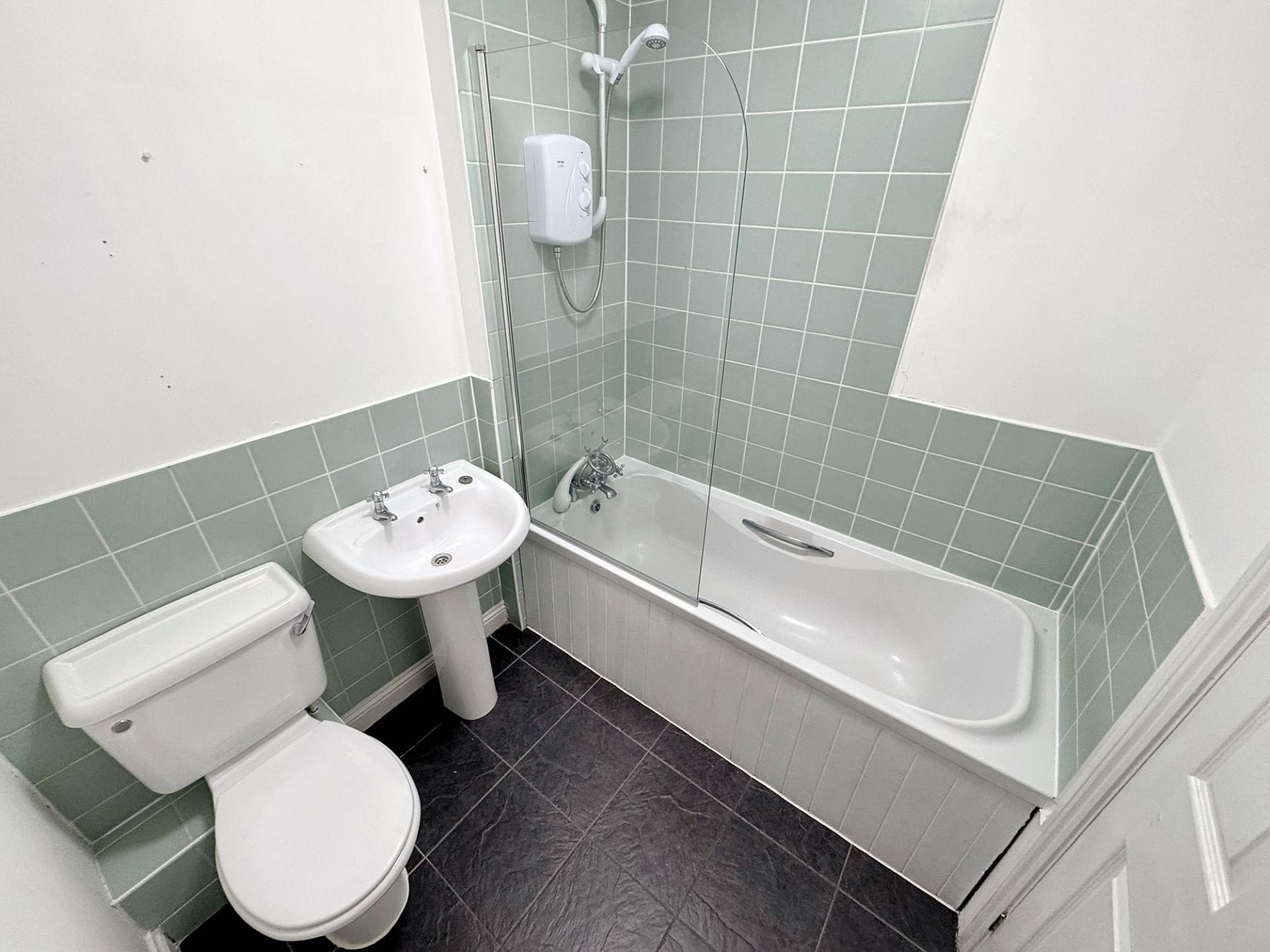- Modern Bathroom – White suite with shower-over-bath, tiled finish, and extractor fan.