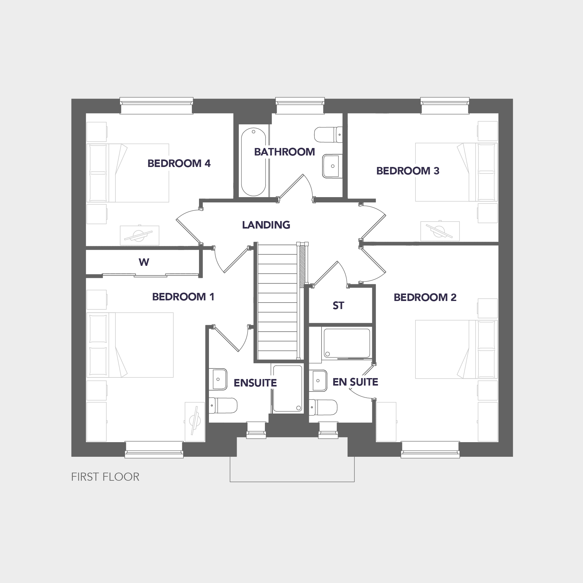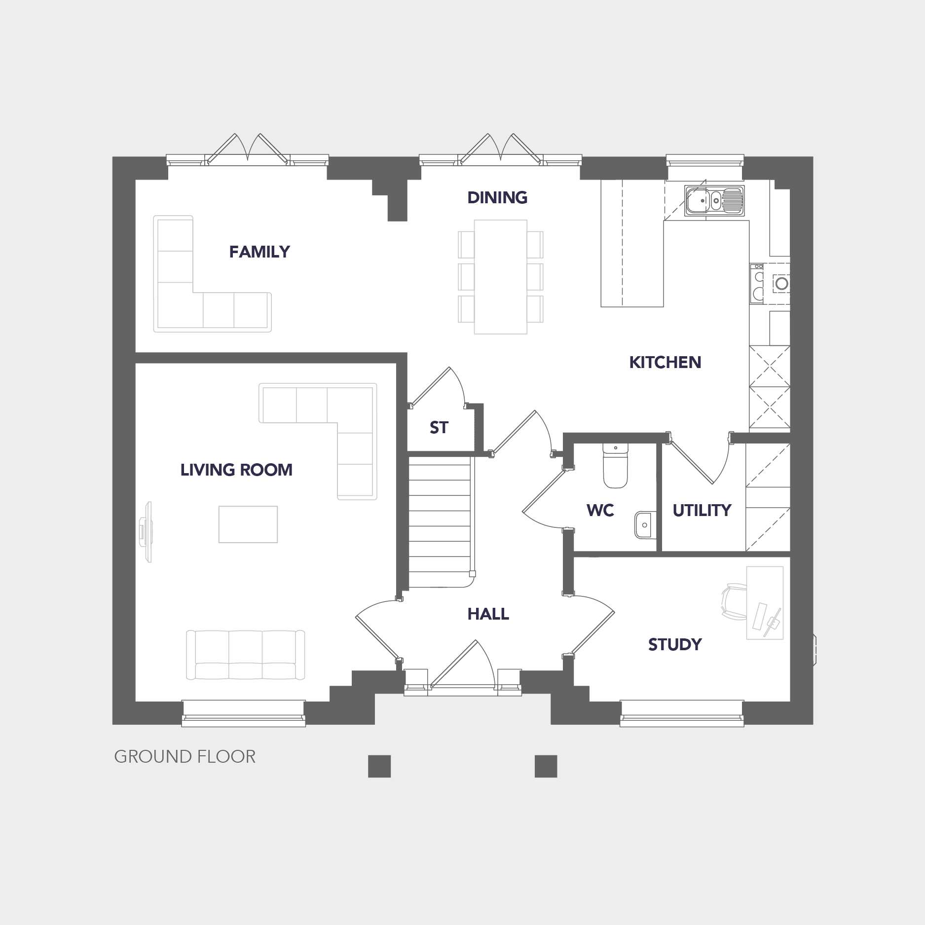 The Foremark - a detached family home offering entrance hall, cloakroom, study, living room, expansive open plan kitchen/dining/family room with french doors to the garden, utility room, on the first floor 4 bedrooms (two en-suite) and family bathroom. Garden and garage with parking for two cars in front.