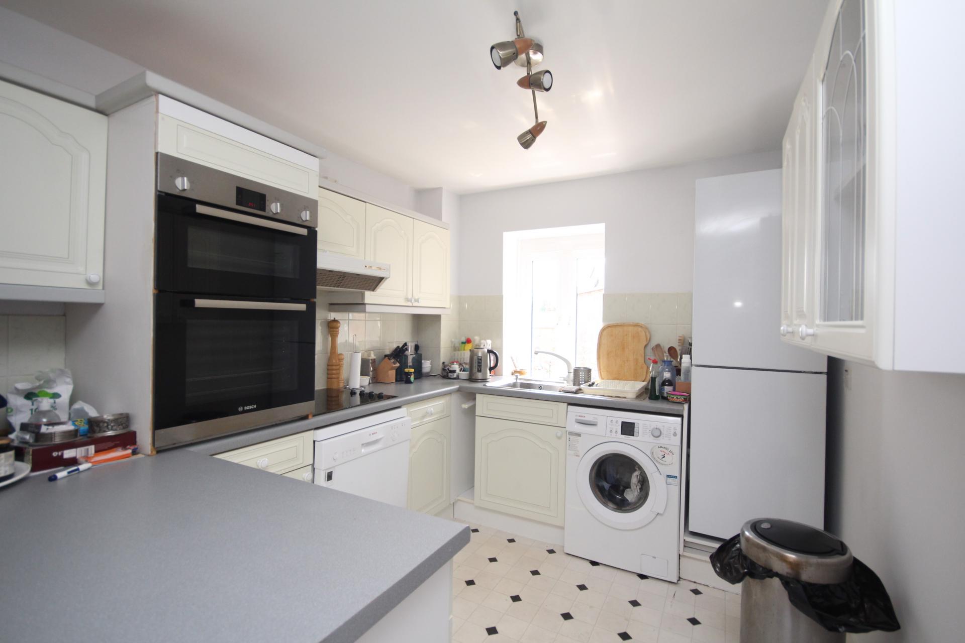 Double glazed window to front, stainless steel sink and drainer with cupboards under and a further range of matching base and wall units, space and plumbing for both washing machine and dish washer, inset four ring halogen hob with extractor hood over, built in electric oven, space for fridge freezer and ceramic wall tiling.