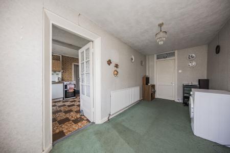 DINING/RECEPTION ROOM: Carpeted, radiator. Window and door to front garden.