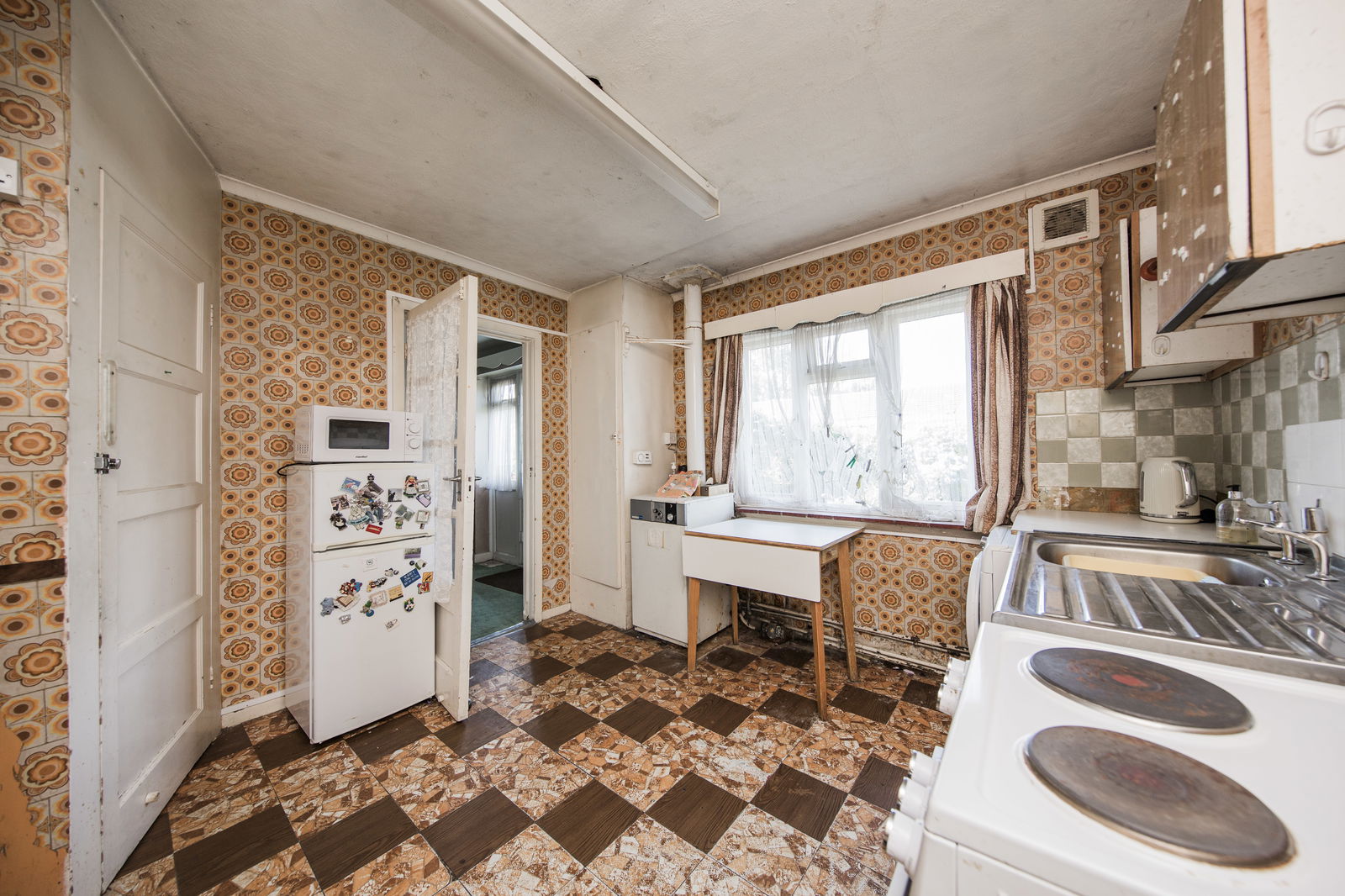 KITCHEN: Fitted with a range of floor and wall cupboards with worktops. Fitted larder. Laminate floor tiles, cupboard housing the hot water tank. Wide window with views of front garden.