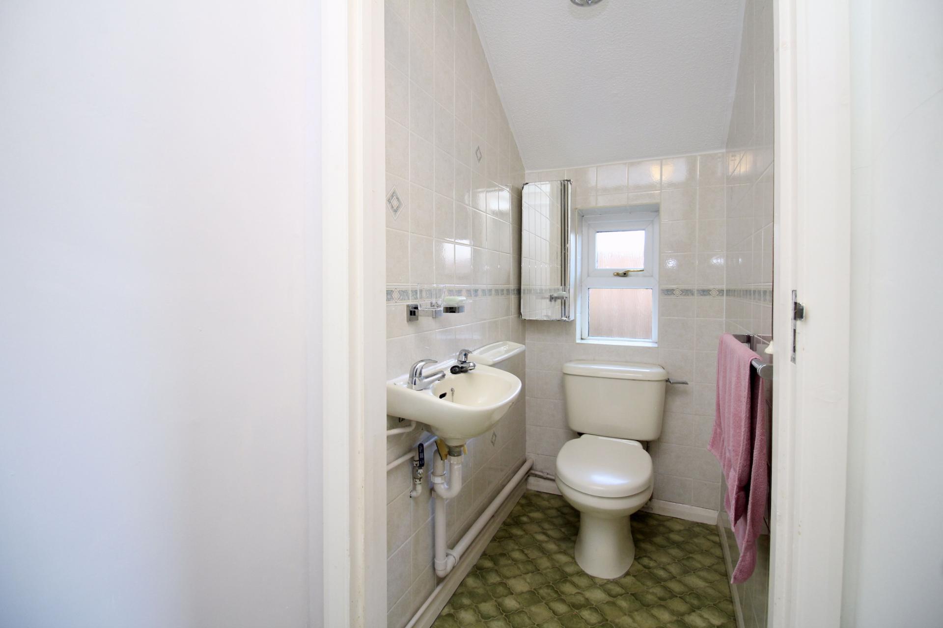 Double glazed frosted window to side, low level W/C, floating hand wash basin, ceramic wall tiling, towel rail and electric radiator.