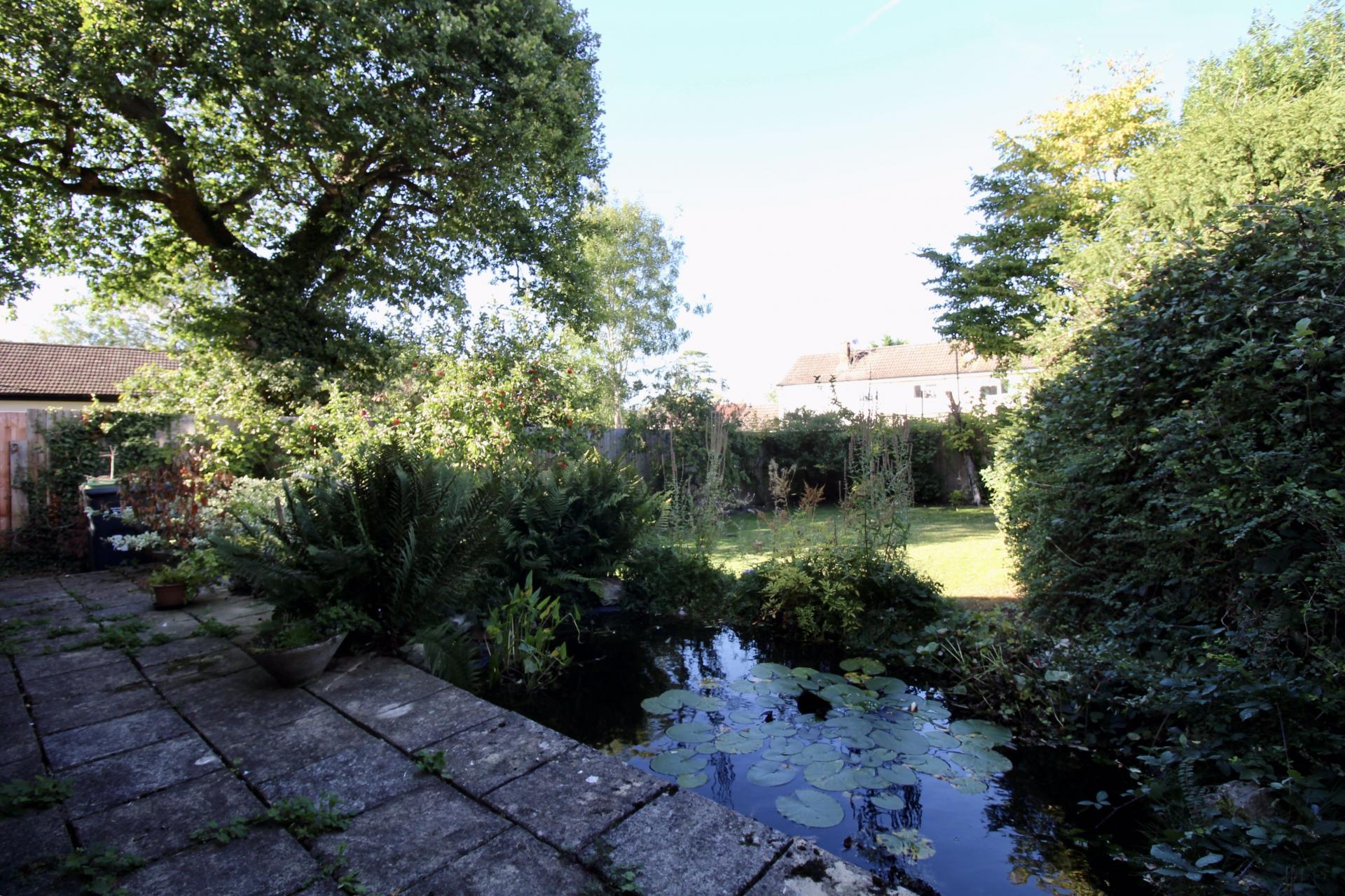 to the rear of the property is a paved patio area with built in pond and steps leading to the remainder of the garden being mainly laid to lawn with flowered borders with established shrubs, plants, trees and bushes, side pedestrian access and outside water tap.