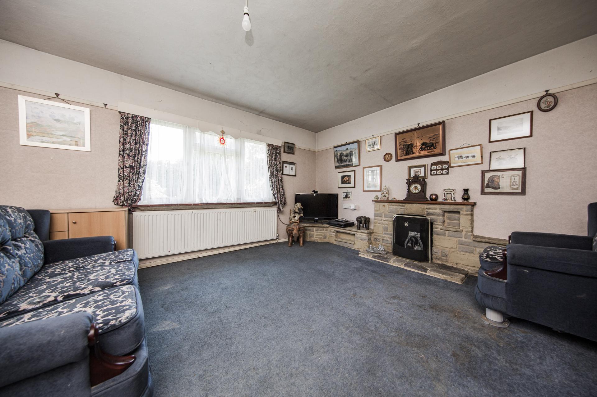 LIVING ROOM: Carpeted, radiator, feature fireplace with stone surround. Wide window with views of garden.