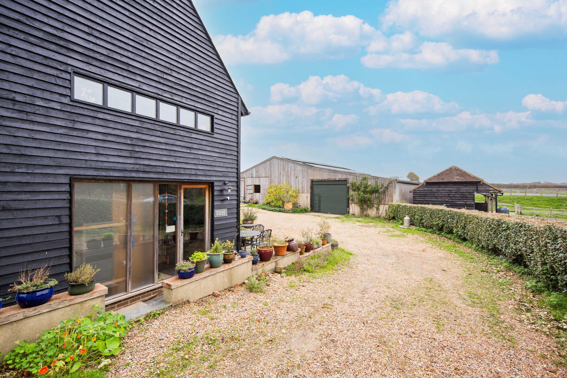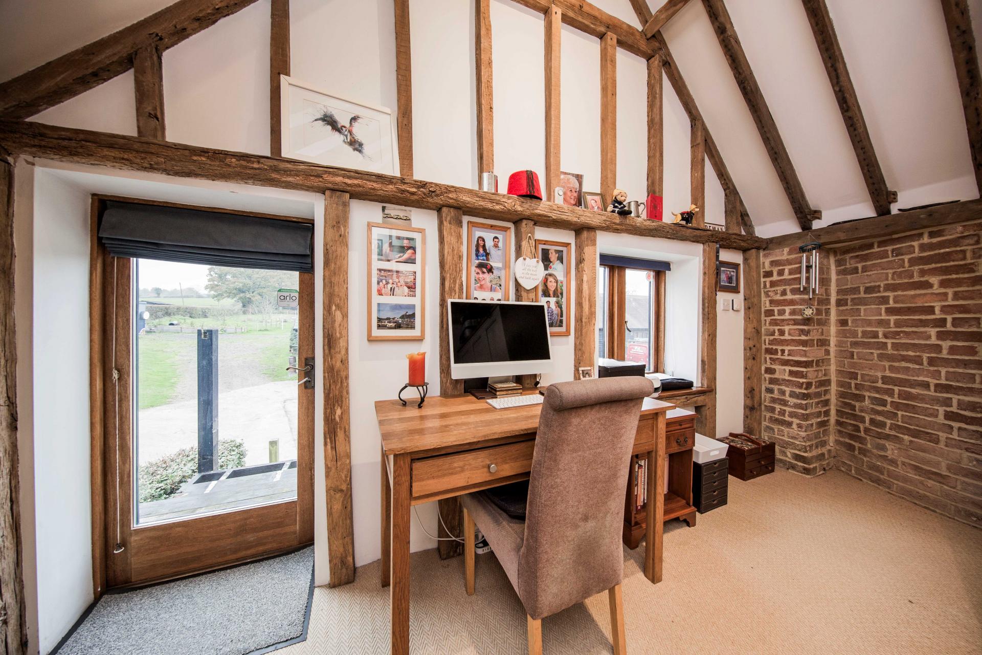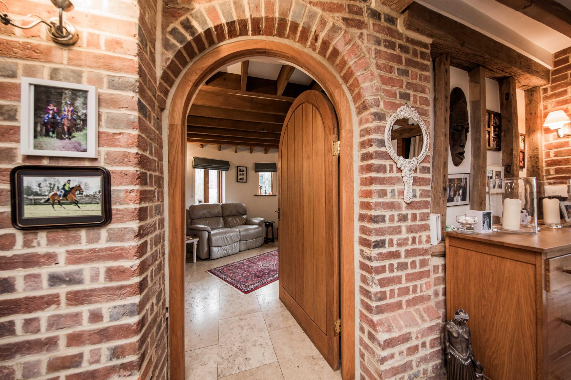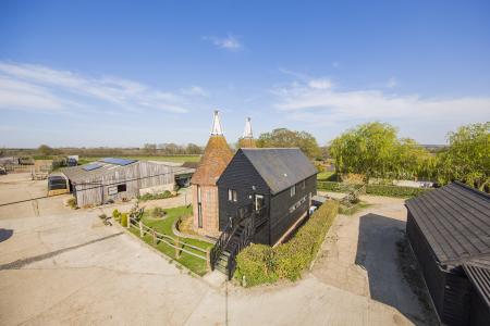 This stunning four-bedroom, two-bathroom twin-roundel oast house blends period charm, boasting iconic roundel structures, featuring exposed beams, brick detailing, and classic oast architecture and is complemented by sleek, contemporary styling throughout with modern amenities, nestled within a scenic working livery yard.