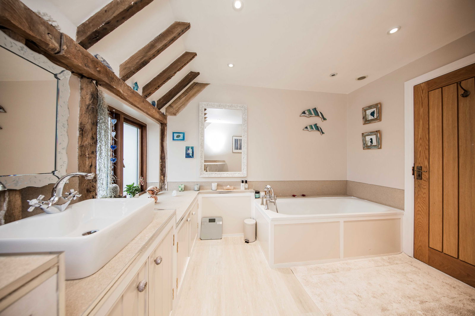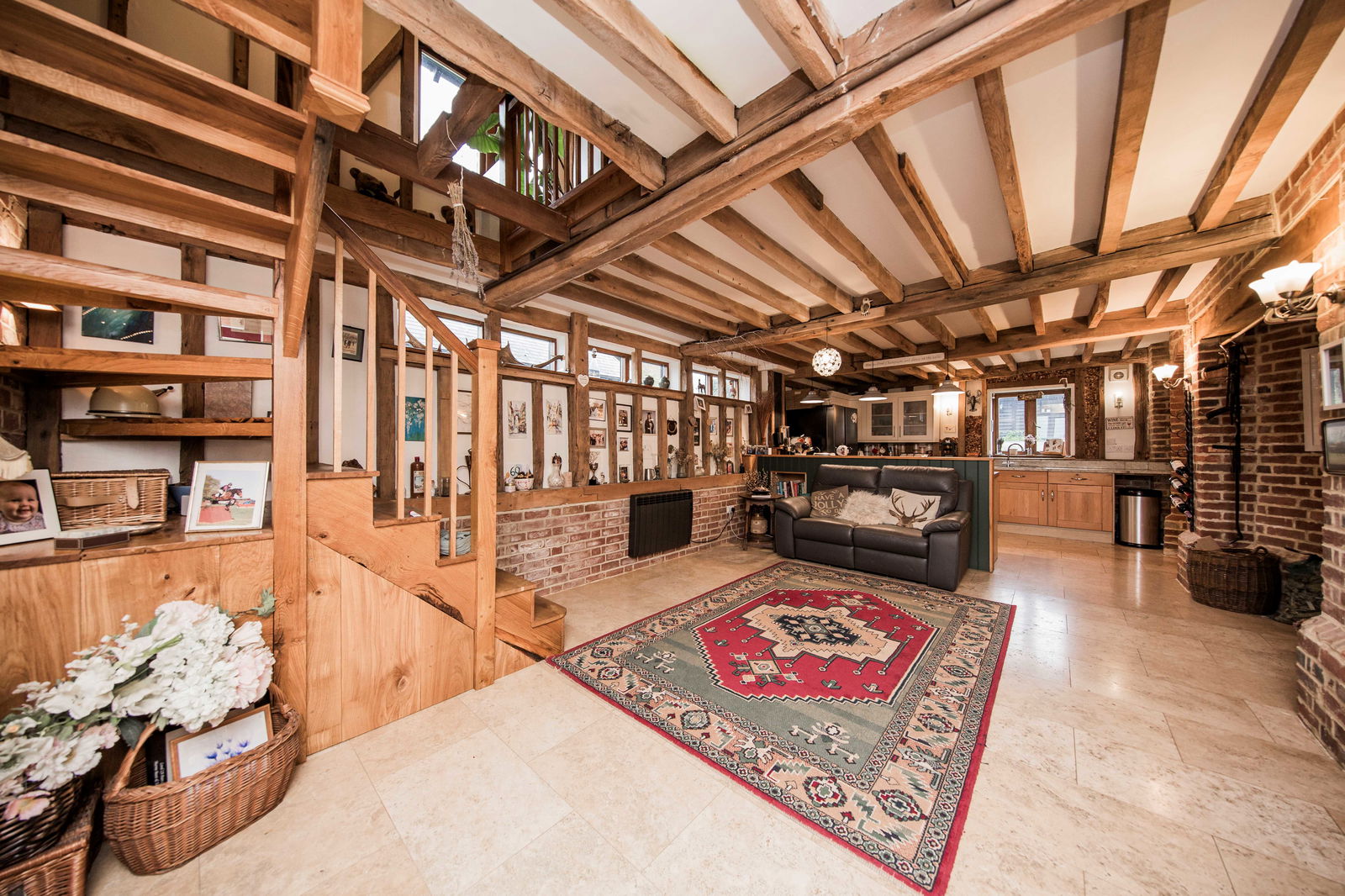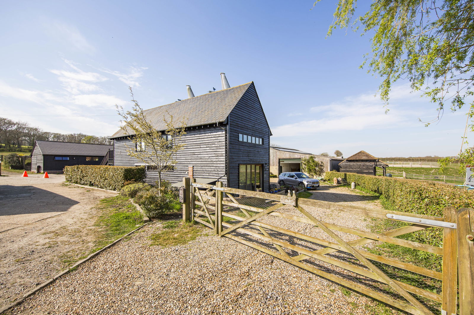 This stunning four-bedroom, two-bathroom twin-roundel oast house blends period charm, boasting iconic roundel structures, featuring exposed beams, brick detailing, and classic oast architecture and is complemented by sleek, contemporary styling throughout with modern amenities, nestled within a scenic working livery yard.