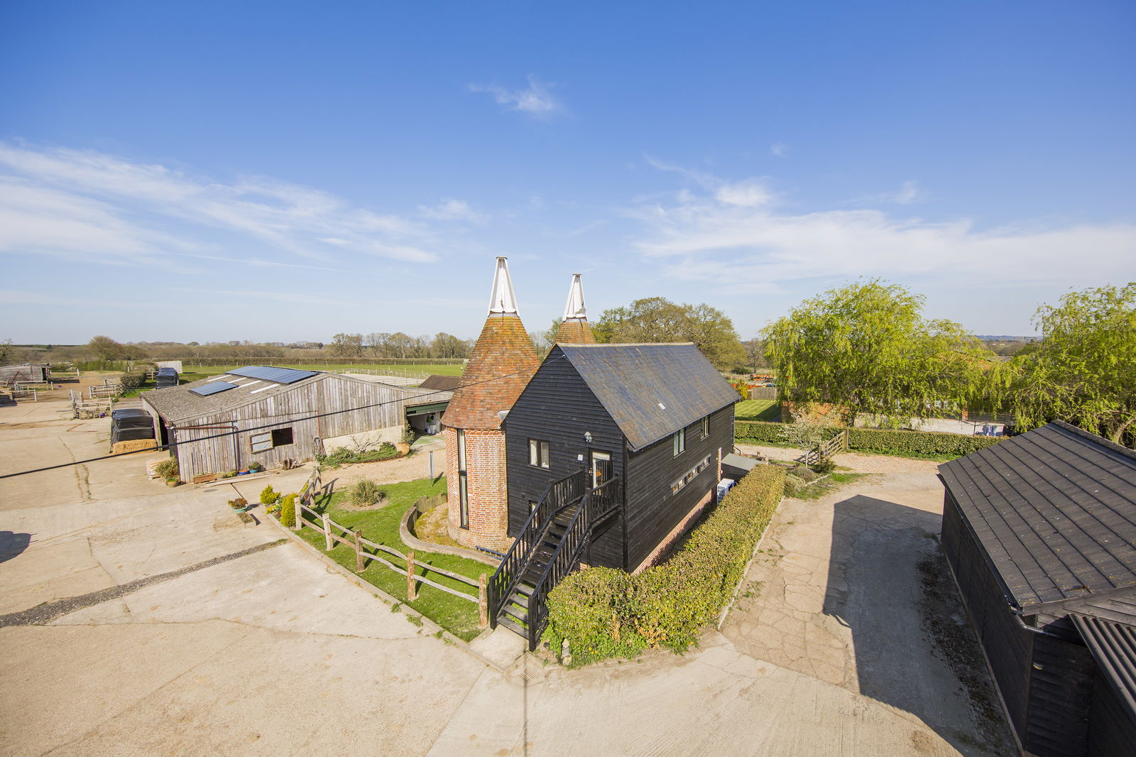 A four bedroom, two bathroom contemporary twin-roundel oast house with historic charm, situated within a working livery...