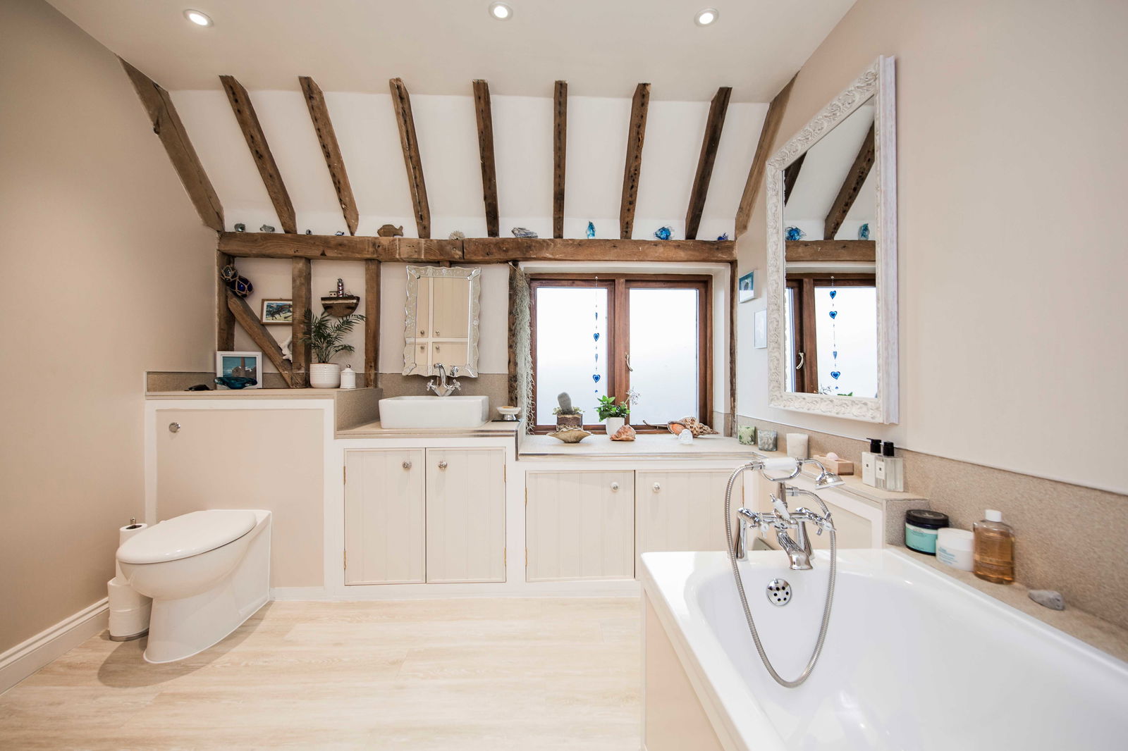 BATHROOM: Modern suite comprising bath with telephone style mixer tap, hand held attachment, vanity unit with basin set onto surface, WC with concealed cistern and cupboards below, frosted double glazes window, large airing cupboard.