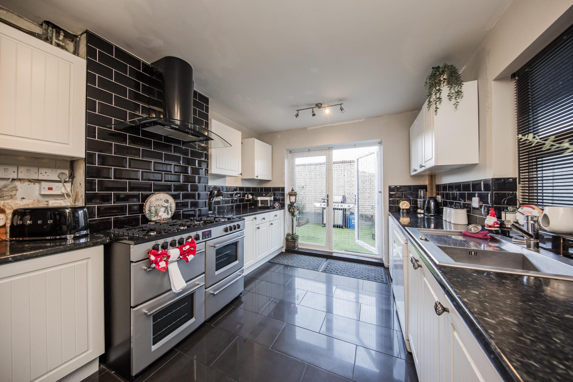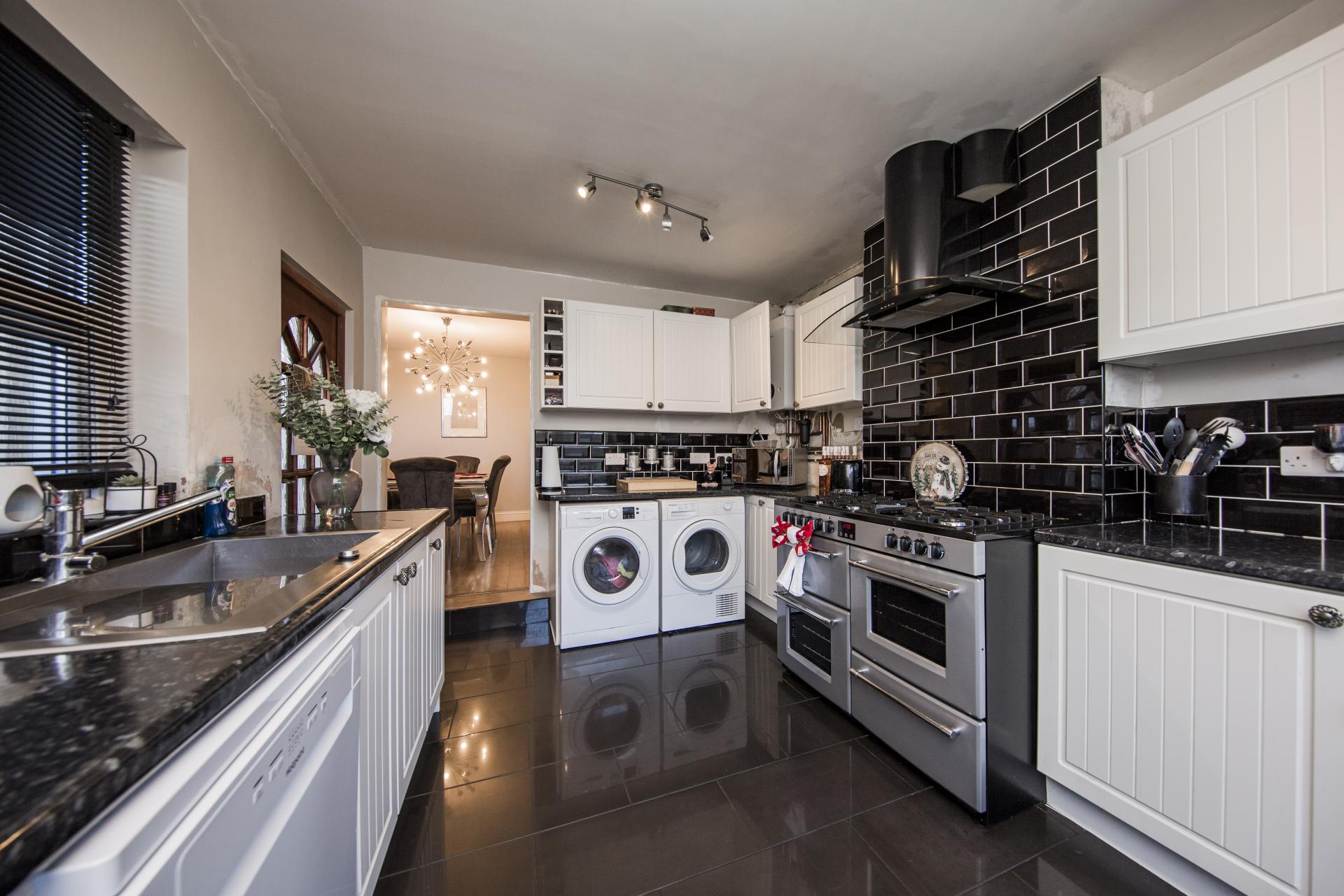 KITCHEN: A modern kitchen with a good range of wall and base units with complementary worktop, large feature Range cooker with extractor hood, space for washing machine, dishwasher, tumble dryer and fridge/freezer, inset stainless steel sink and drainer with mixer tap, wall mounted gas central heating boiler. double glazed window to side, double glazed patio doors opening on to the rear garden, tiled flooring.