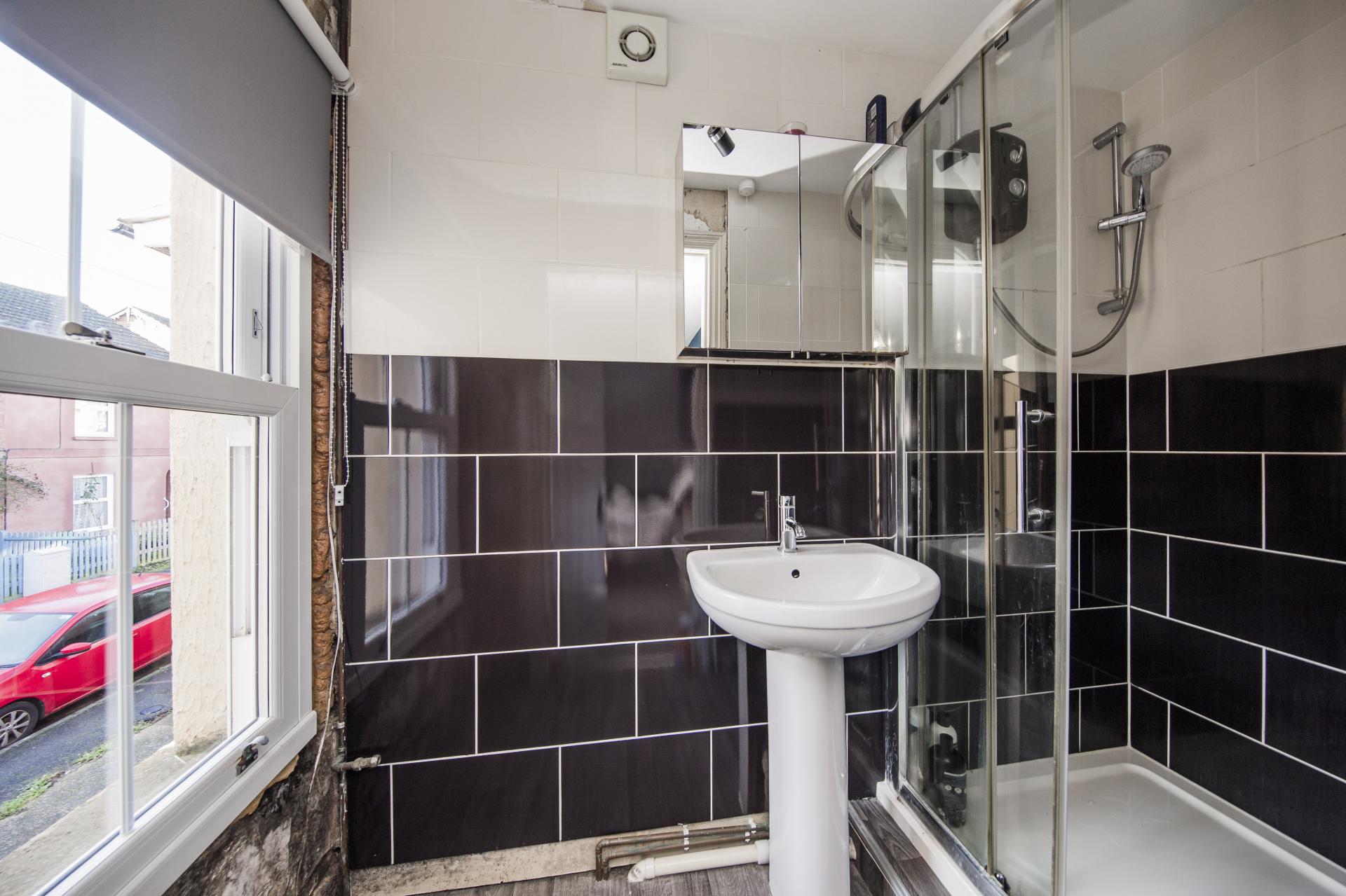 SHOWER ROOM: Corner shower cubicle with Triton shower, pedestal wash hand basin, part tiled walls, double glazed sash window to front, laminate flooring.