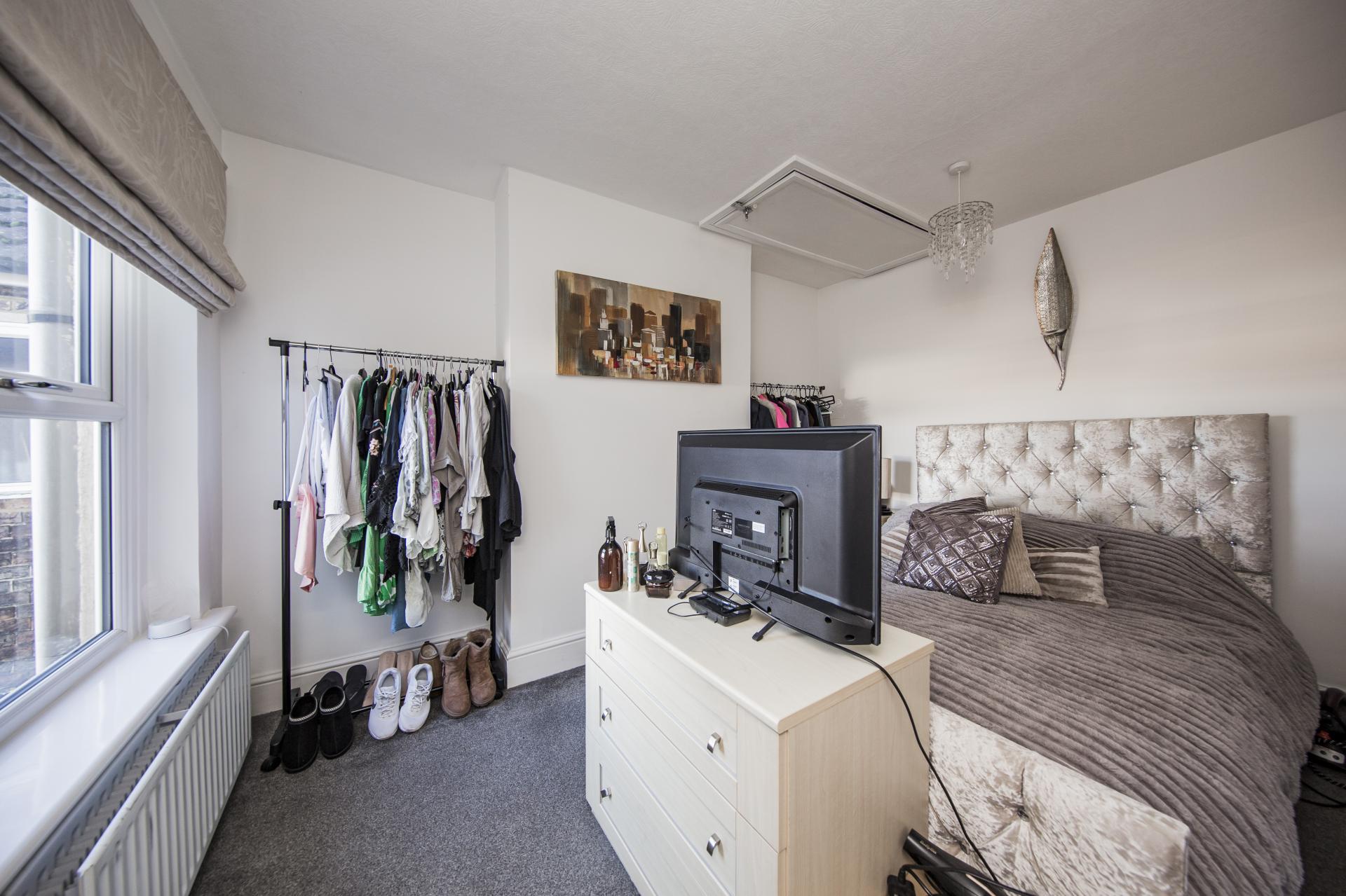 BEDROOM: A double room, double glazed sash window to rear, carpeted, radiator, loft access.