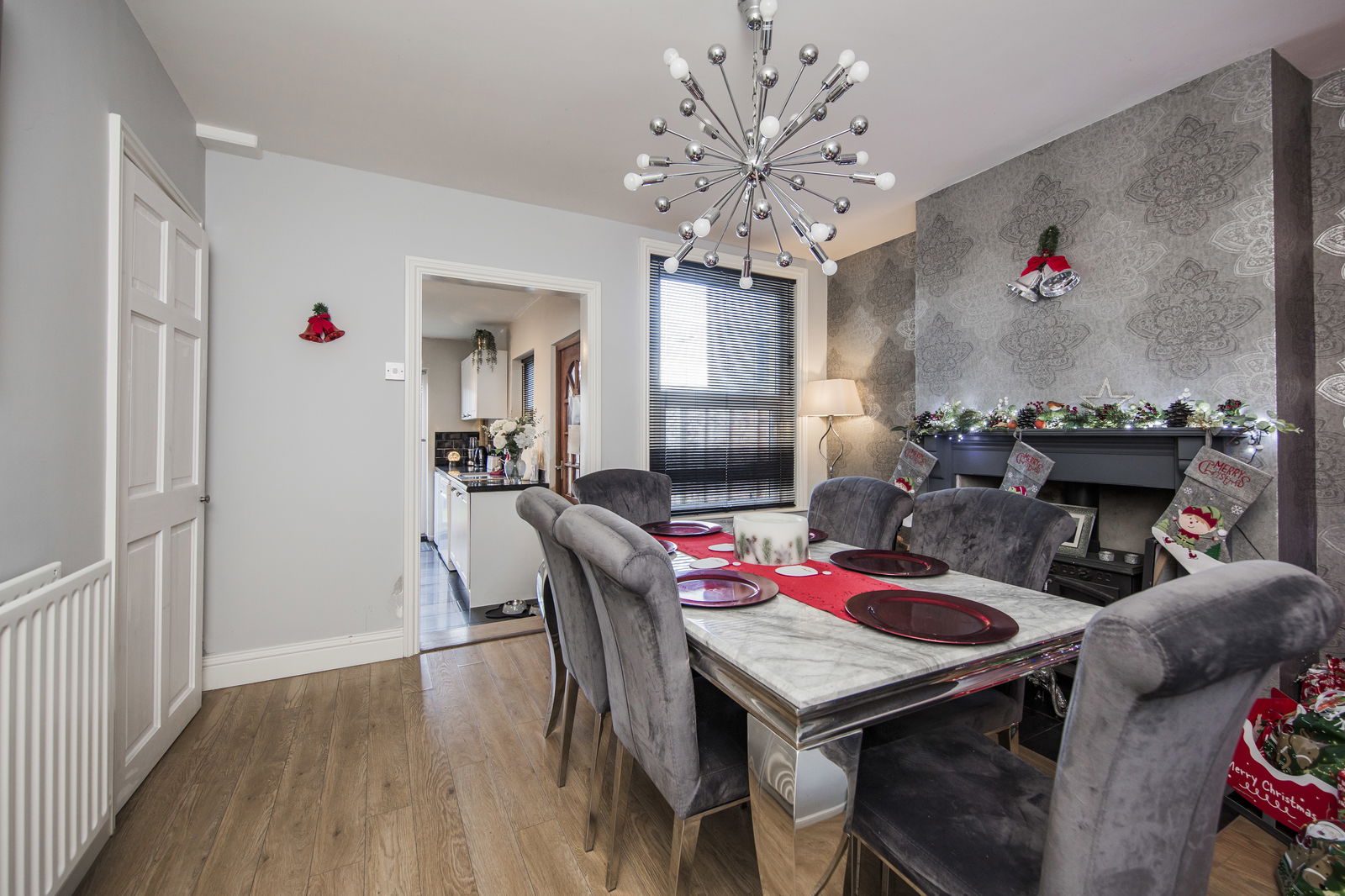 DINING ROOM: Double glazed window to rear, feature fireplace with log burner, laminate flooring, radiator.